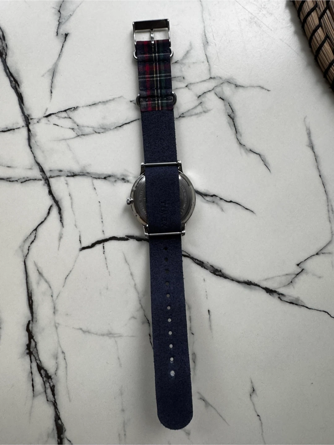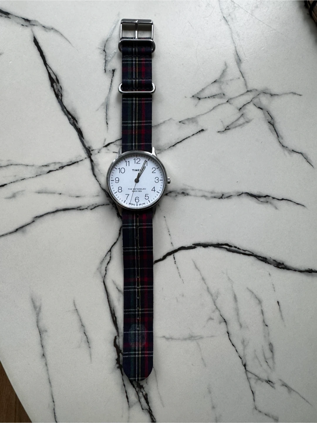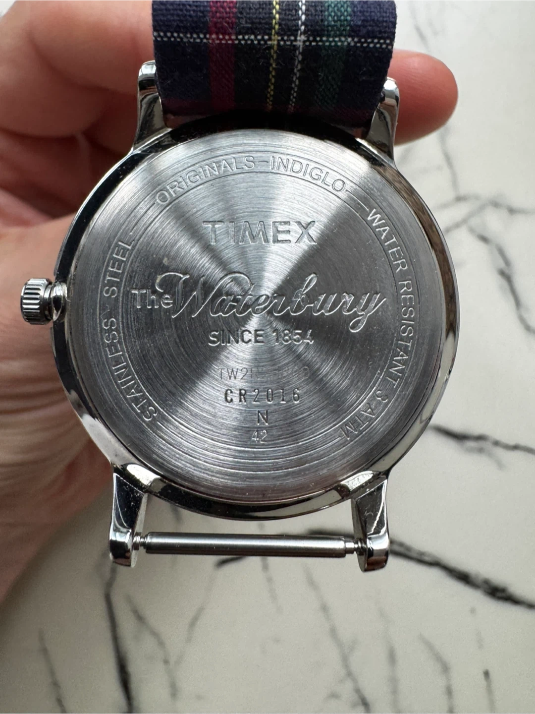 10Selling a Timex The Waterbury watch. It features a stainless steel case and a unique plaid band. The watch is water-resistant up to 3 ATM. I don’t have the packaging but the watch has never been worn.