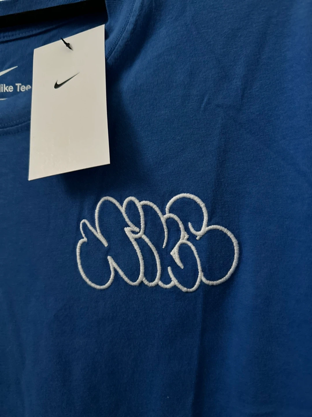 Selling a blue Nike T-shirt, also known as "The Nike Tee"! It features a unique design on the front. Great for casual wear
