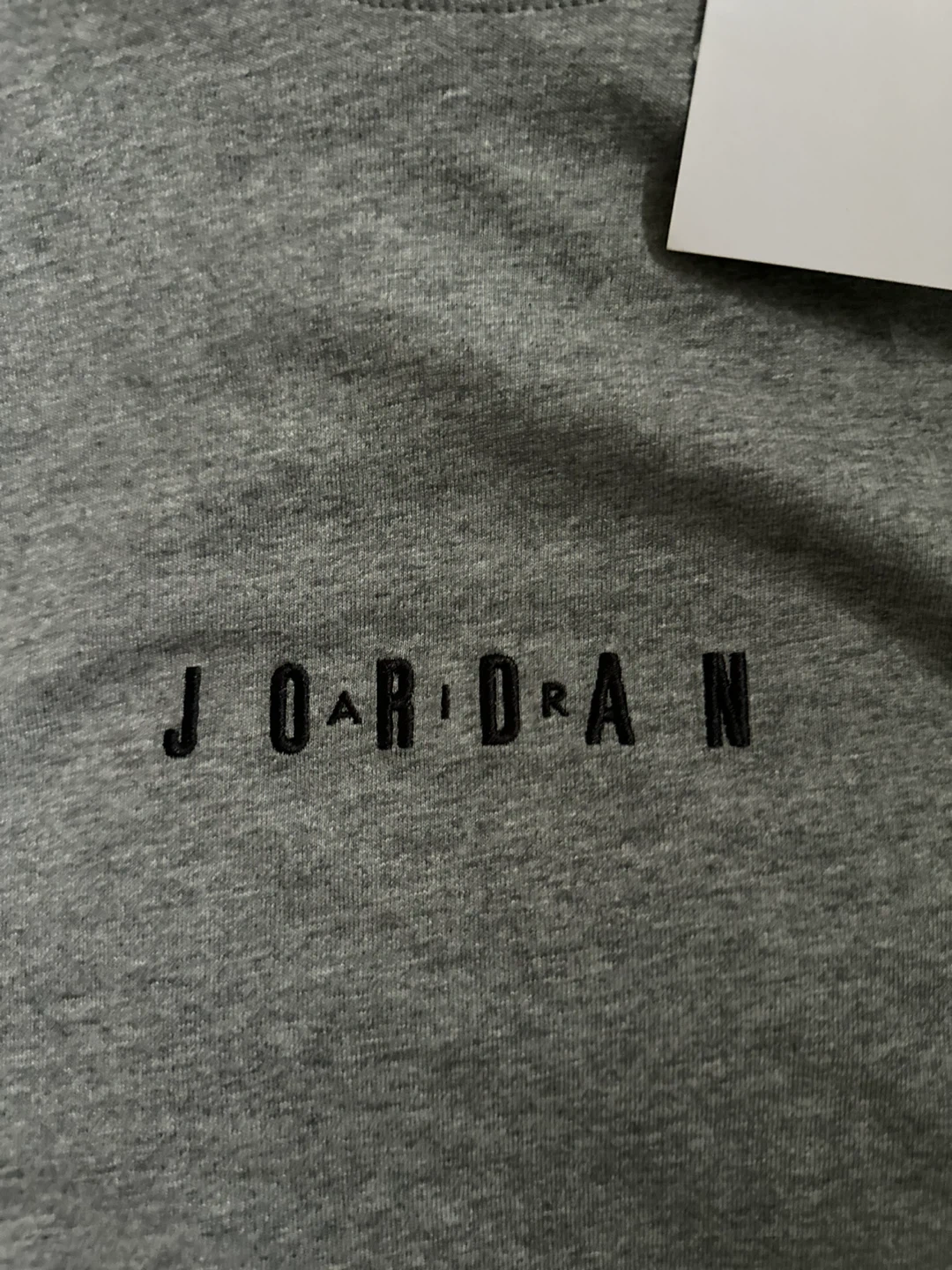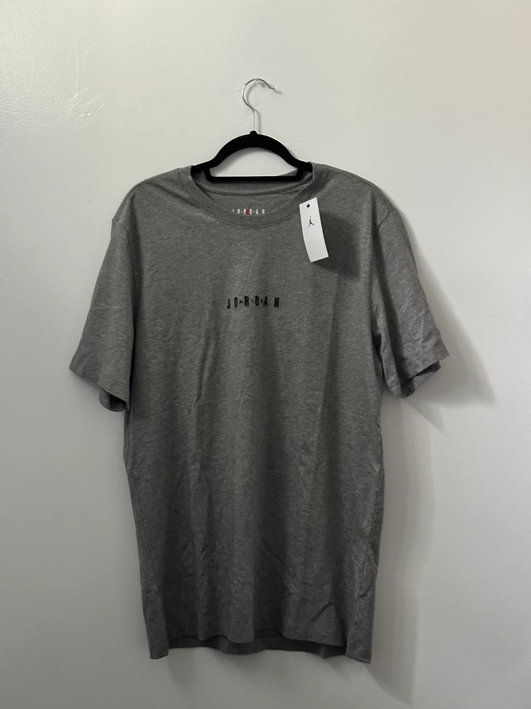 Selling a gray Jordan T-shirt! It's in great condition and ready for a new home. The shirt features the Jordan logo embroidered on the front. Feel free to reach out if you're interested!
