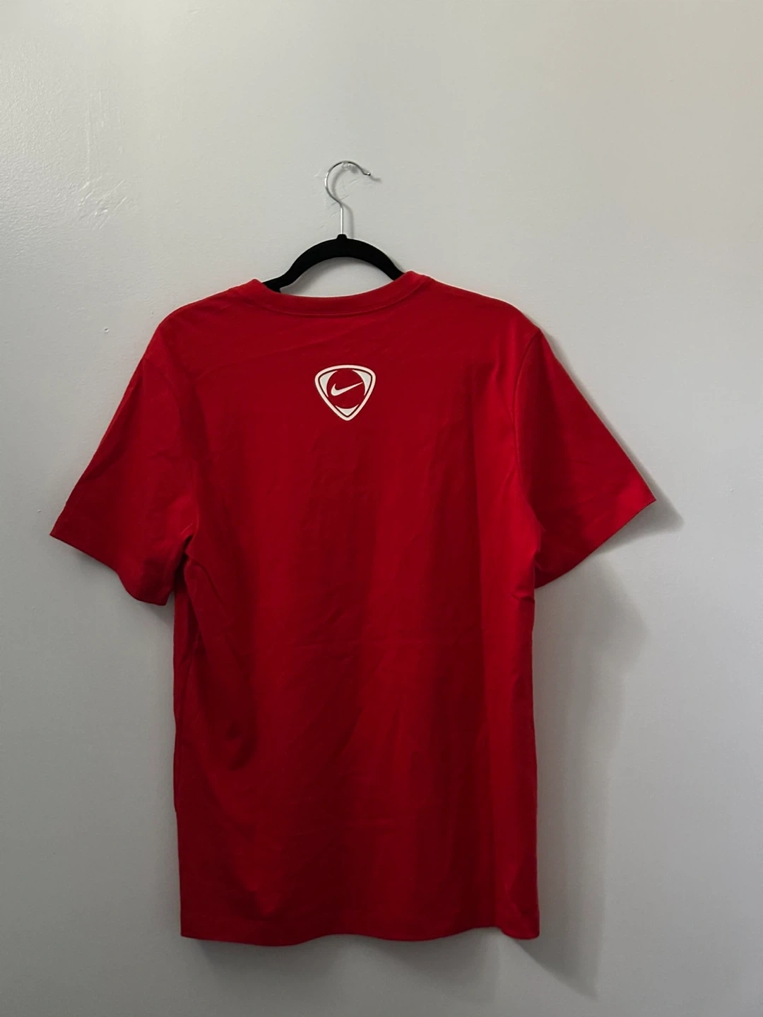 Selling a red Nike t-shirt with a distinctive '90' logo on the front and a Nike logo on the back. It's in great condition and ready for a new owner! Perfect for casual wear or sports activities.