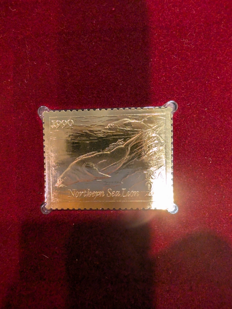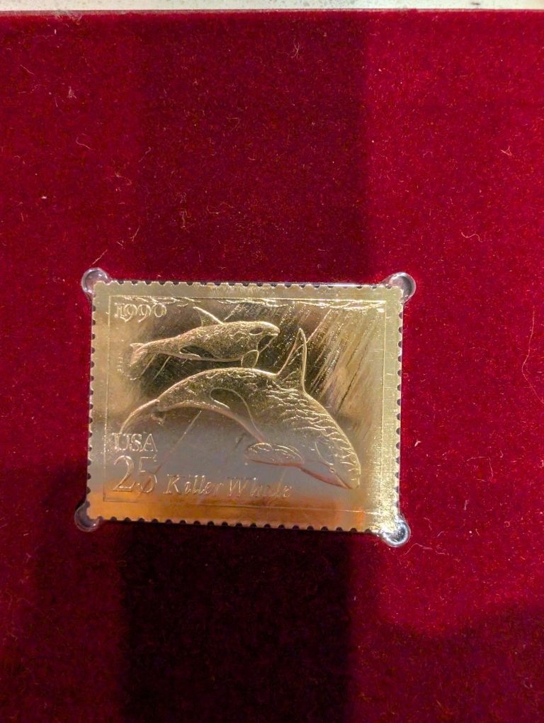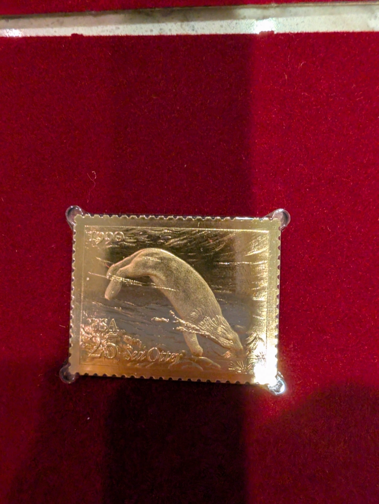 Selling a four 1990 USA 22 KT gold stamp featuring creatures of the sea northern sea lion, sea otter, killer whale and compact of free association .This unique collectible is in great condition and would be a wonderful addition to any stamp collection. The stamp is encased in a protective holder.