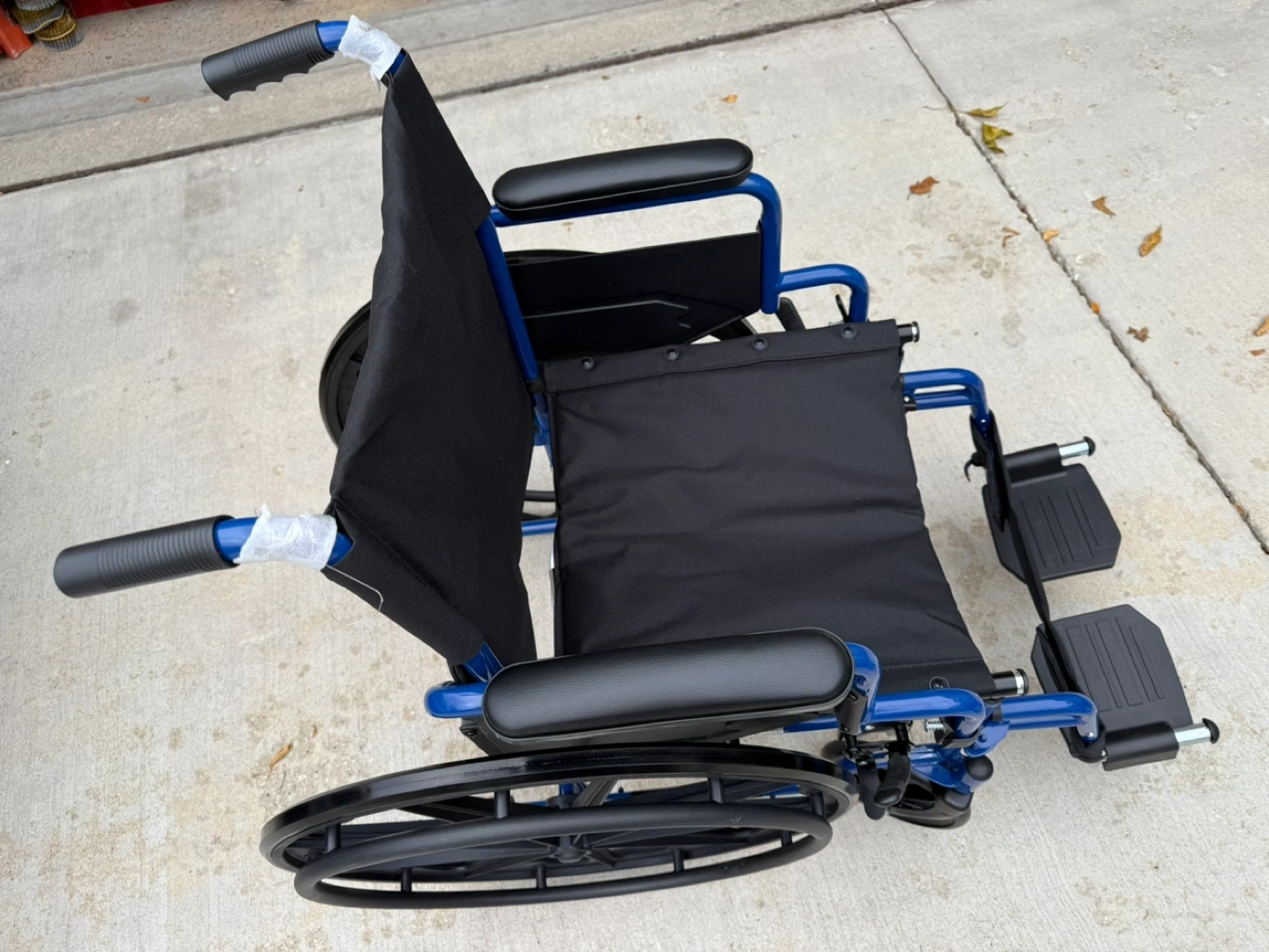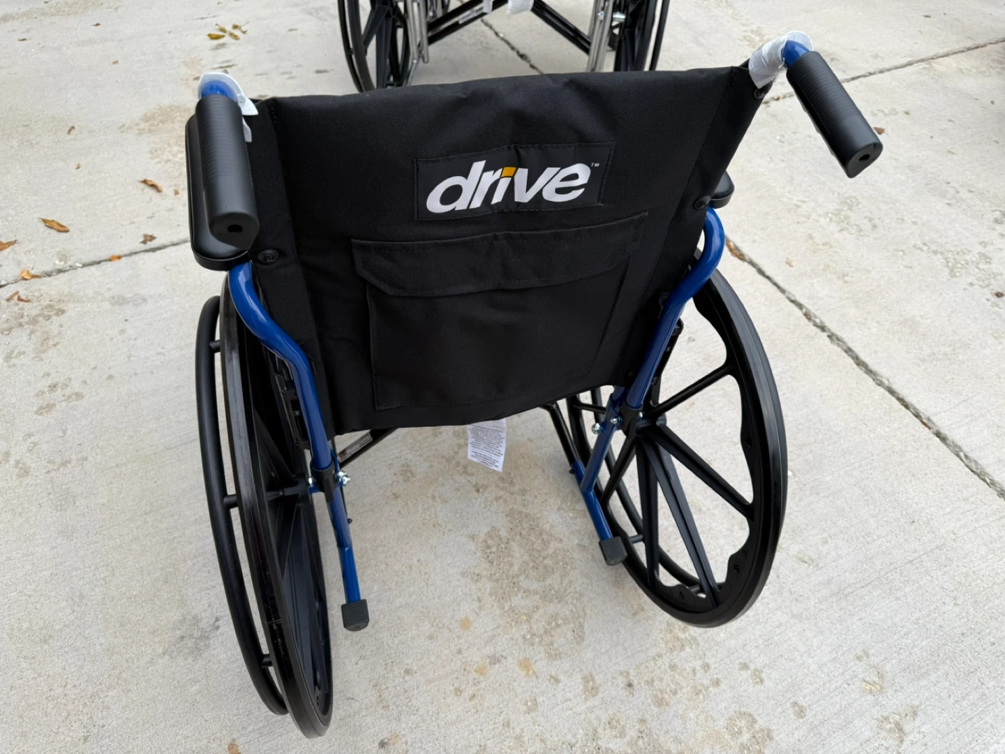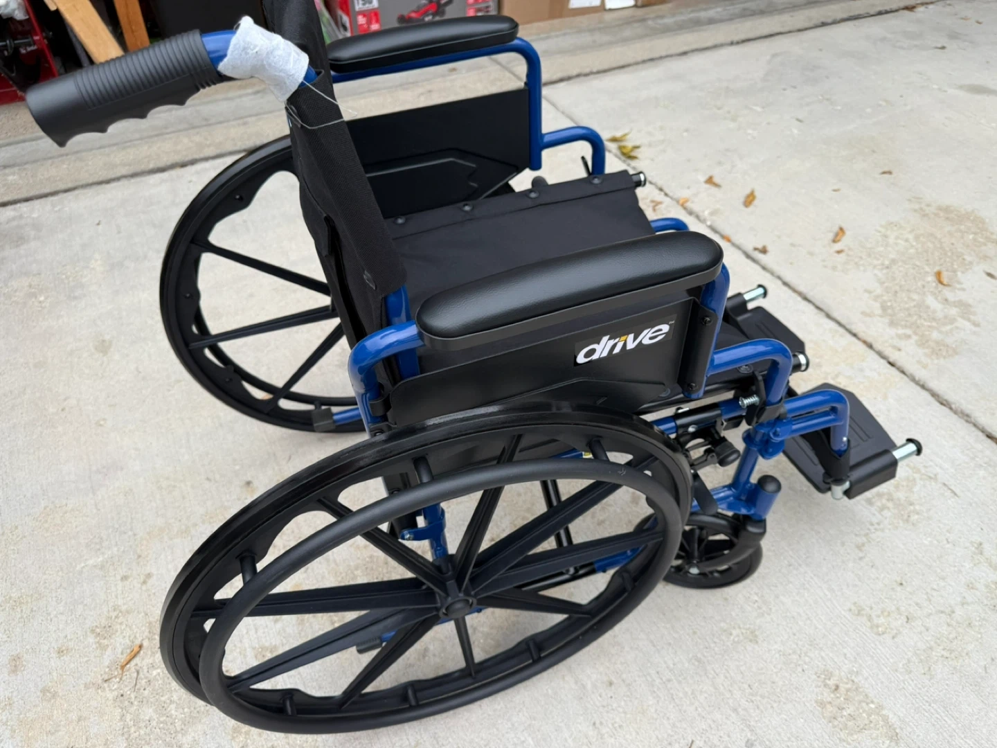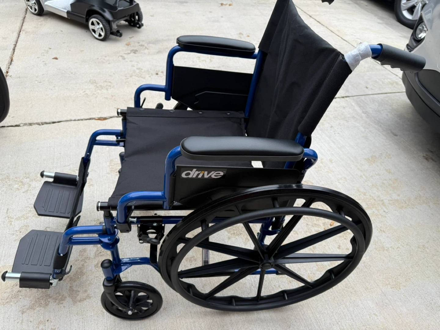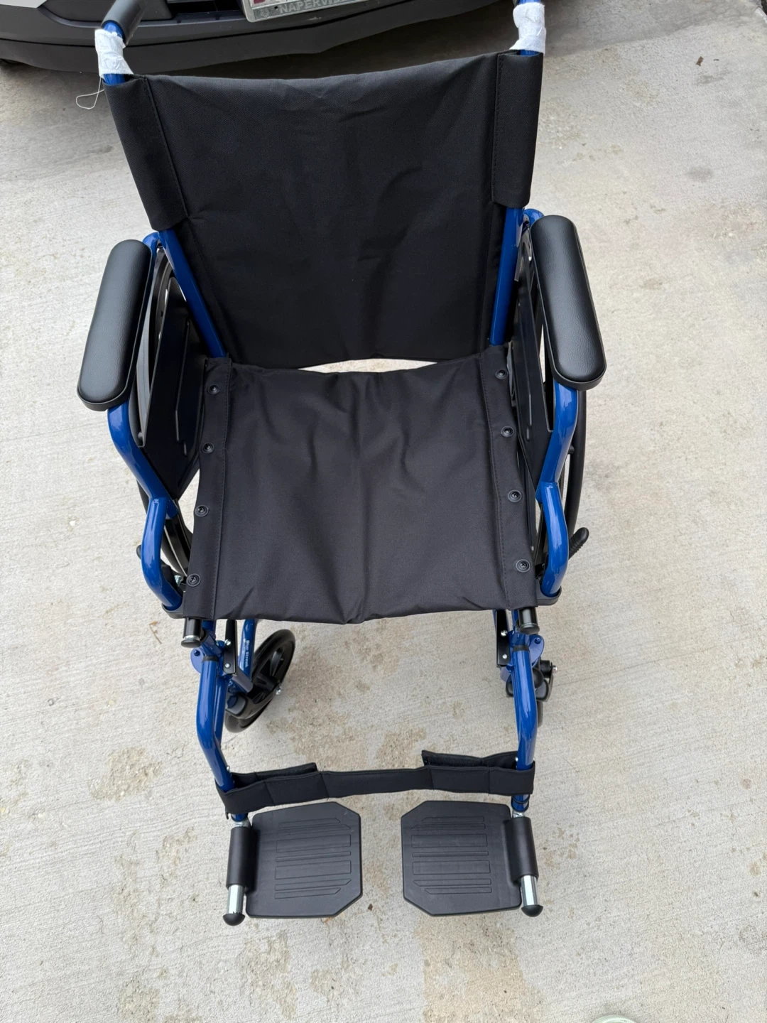 Selling a brand new Drive wheelchair! It's blue and black and ready to go. Still has the plastic on the handles, never been used
