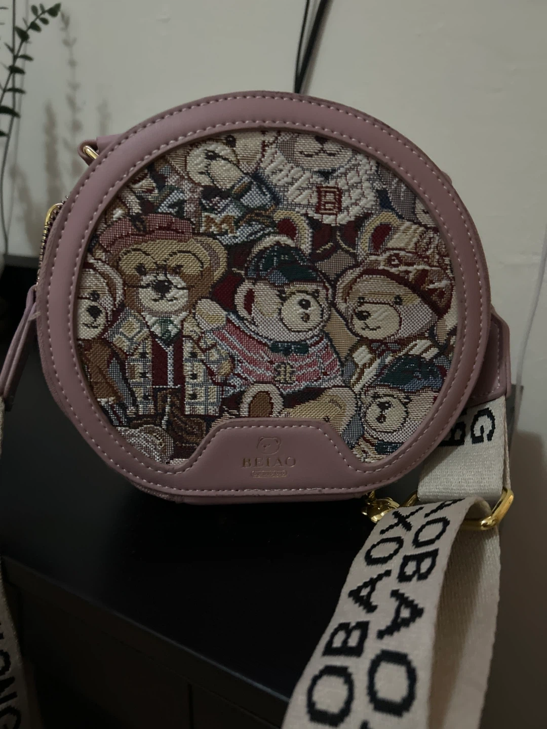 Super cute round crossbody bag from BEIBAOBAO! It has a fun teddy bear design on the front and a stylish strap. The bag is in great condition and ready for a new home