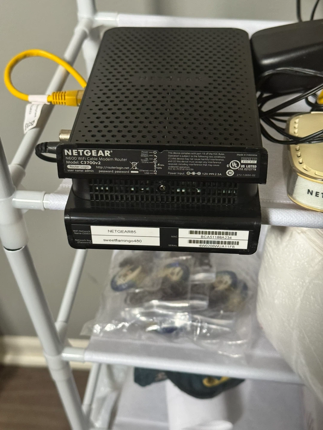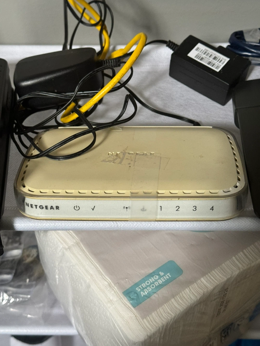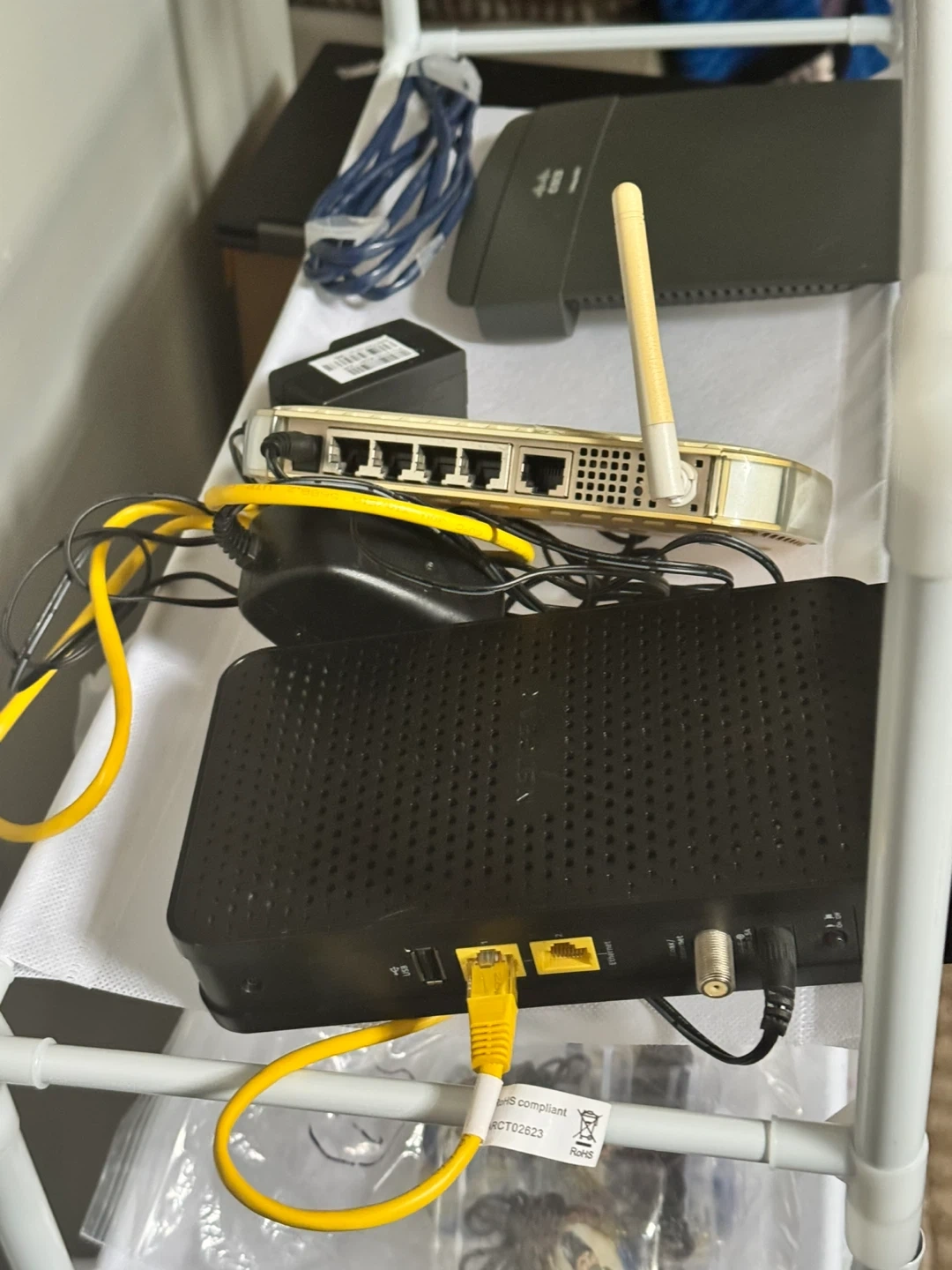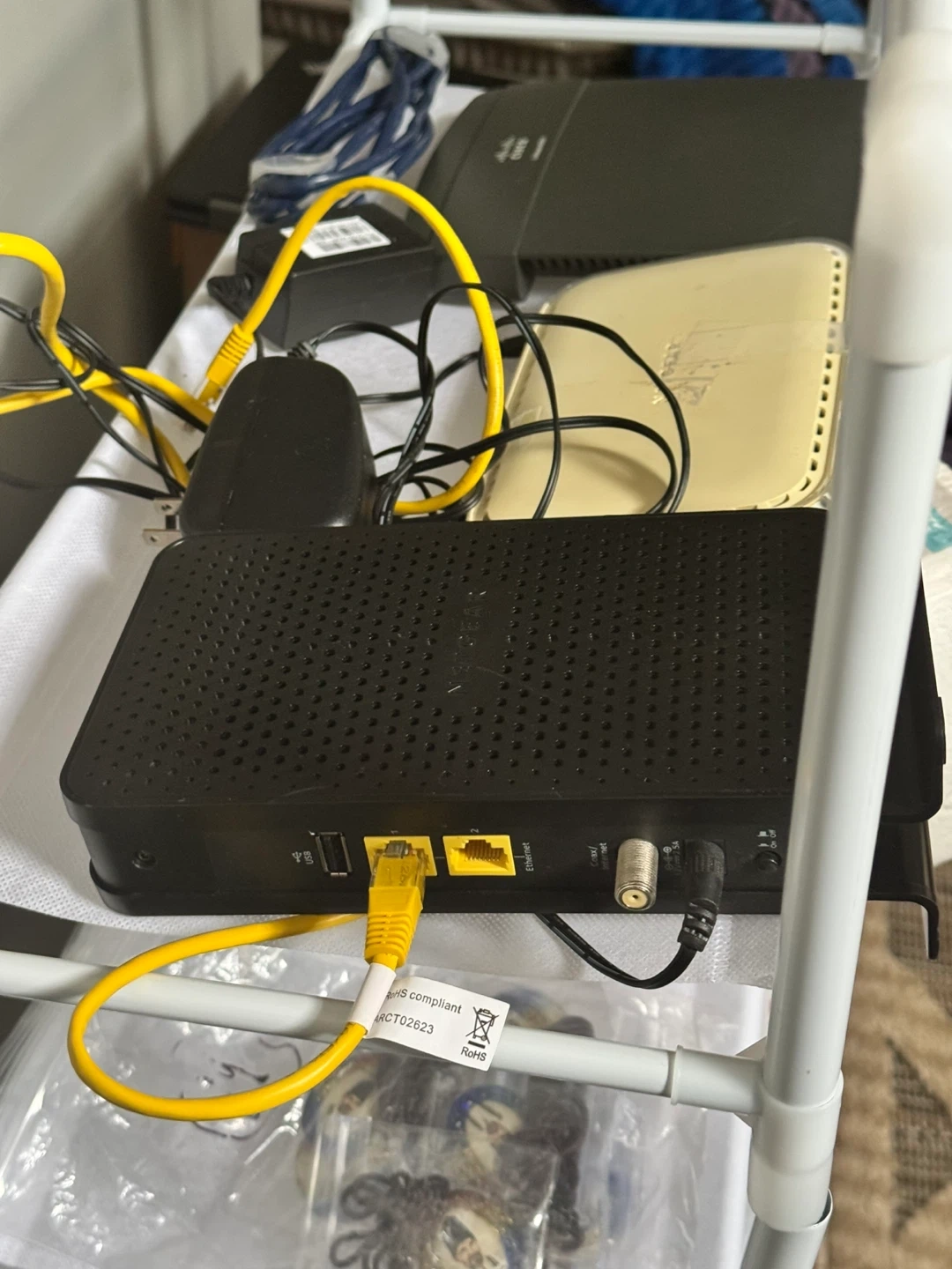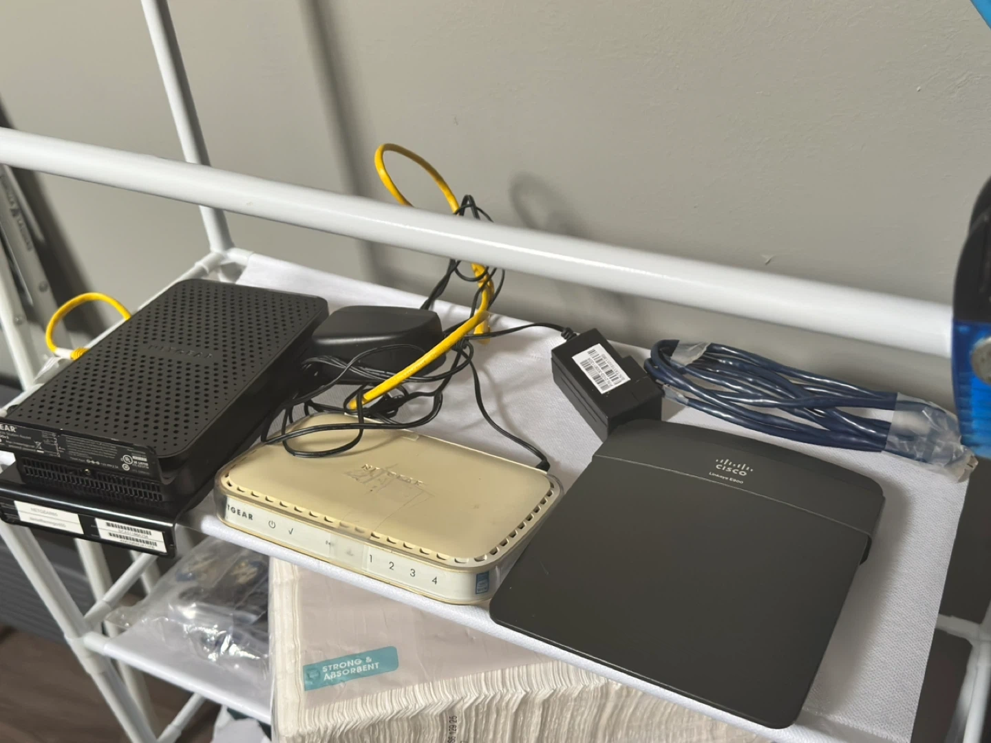 103This package deal contains three routers each with their own Ethernet cables attached and two NETGEAR routers have their power cables attached too. The Cisco router doesn’t have a power cord but it’s easy enough to find or you might have one sitting somewhere at home. I could not test them at home since I have the cellular modem provided by T-Mobile and found these sitting in my garage. Even the power cables and plugs alone should cover the cost of these three routers as where else can you find 3 routers, 2 power cables, chargers and 3 Ethernet cables so cheap. This comes from a virus free, smoke free and pet free home. Local pickup is by Schaumburg and Barrington Road in Schaumburg IL 60194 or shipping is available too for one low fixed cost to anywhere in the 50 States with tracking information included for free. Available for local pickup by Schaumburg and Barrington Road in Schaumburg IL 60194 or shipping to your doorstep for one low price with tracking included for free. Comes from a virus free, smoke free and pet free home.
