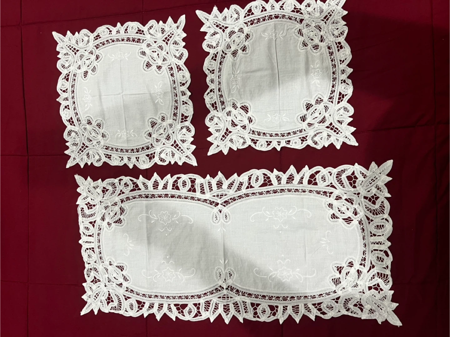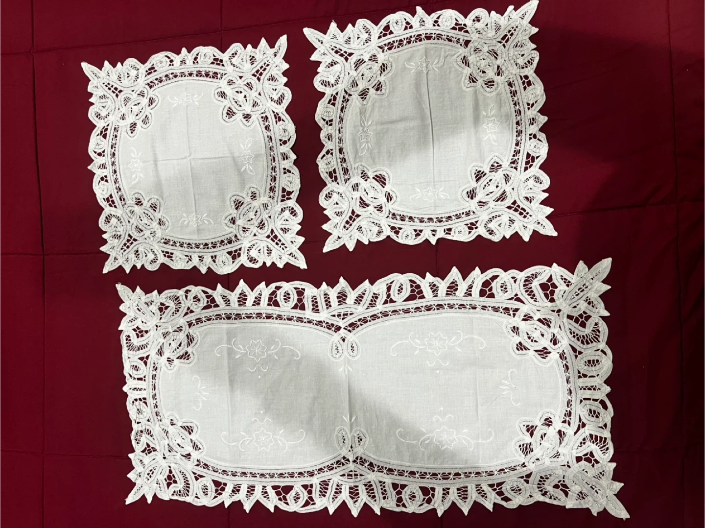 10Beautiful white lace tablecloth set, perfect for adding a touch of elegance to your home! The set includes three pieces with delicate floral patterns and intricate lace detailing