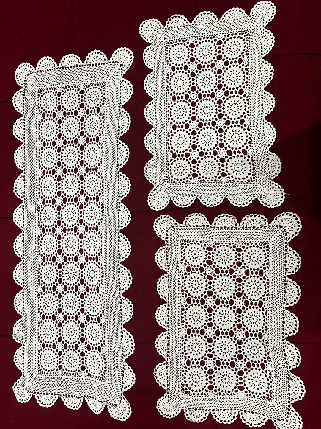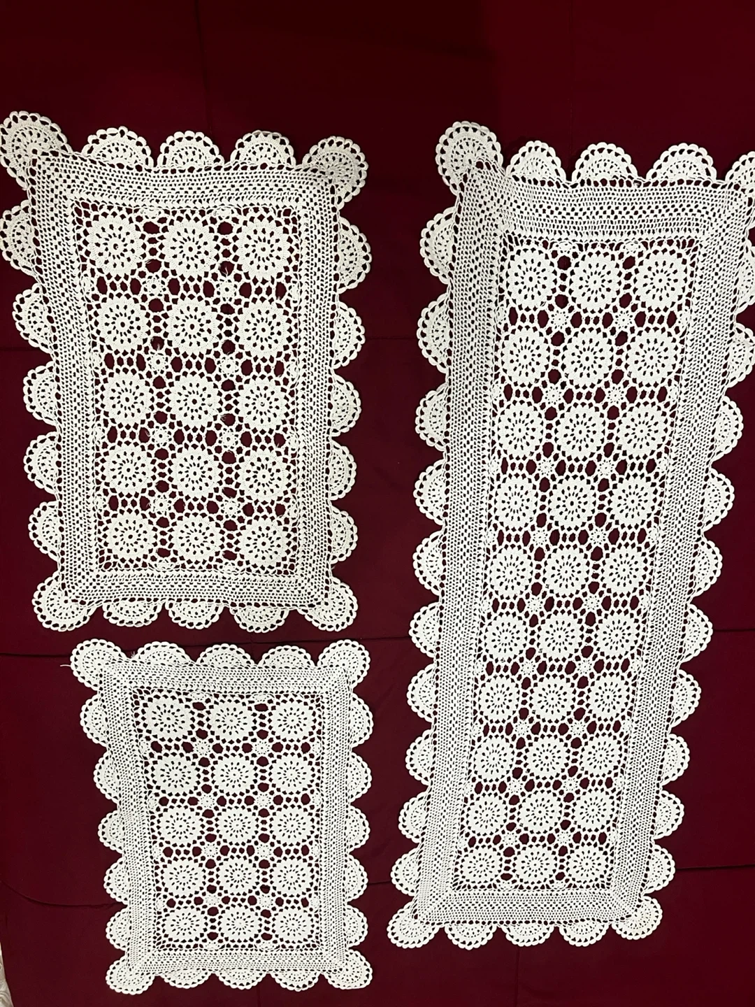 10Selling a set of handmade crochet table linens. These are beautifully crafted with a delicate, intricate design. Perfect for adding a touch of vintage charm to your home decor!