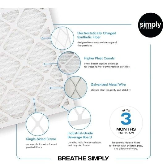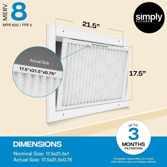 Measuring 17.5" x 21.5" x 1", with an actual size of 17.5"x21.5" x 0.75", Simply Filters works with almost any brand. Comparable to 3M Filtrete MPR 600, Filterbuy AFB Silver, and Honey well FPR 5.