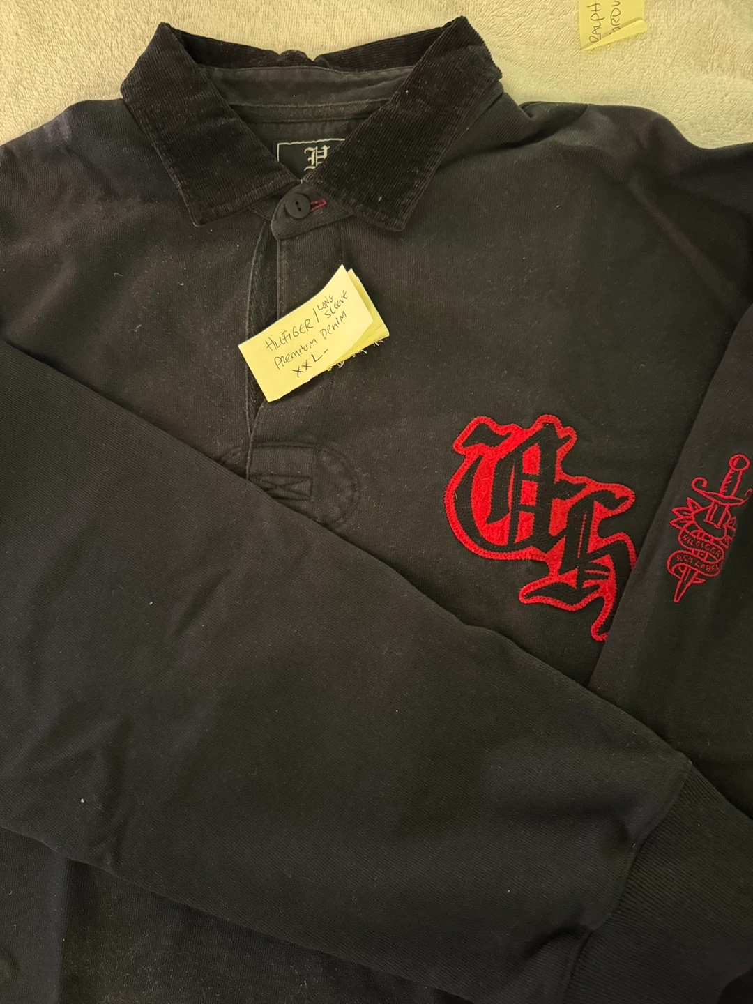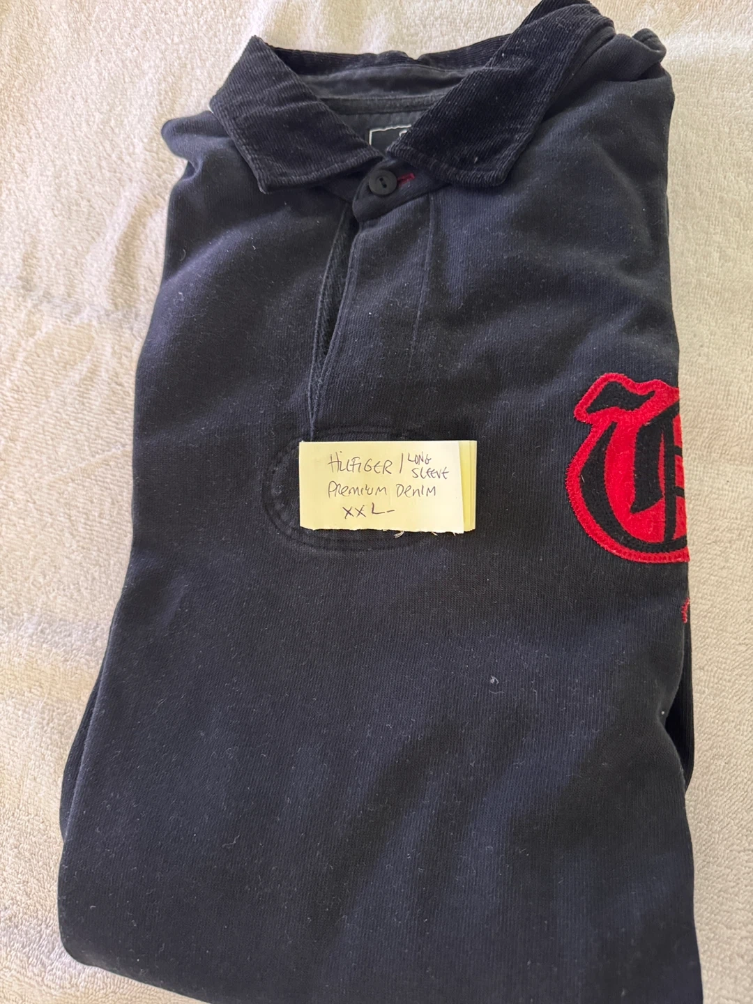 10Here's a Hilfiger long sleeve premium denim shirt in size XXL. It features a corduroy collar and red embroidery on the sleeve and chest