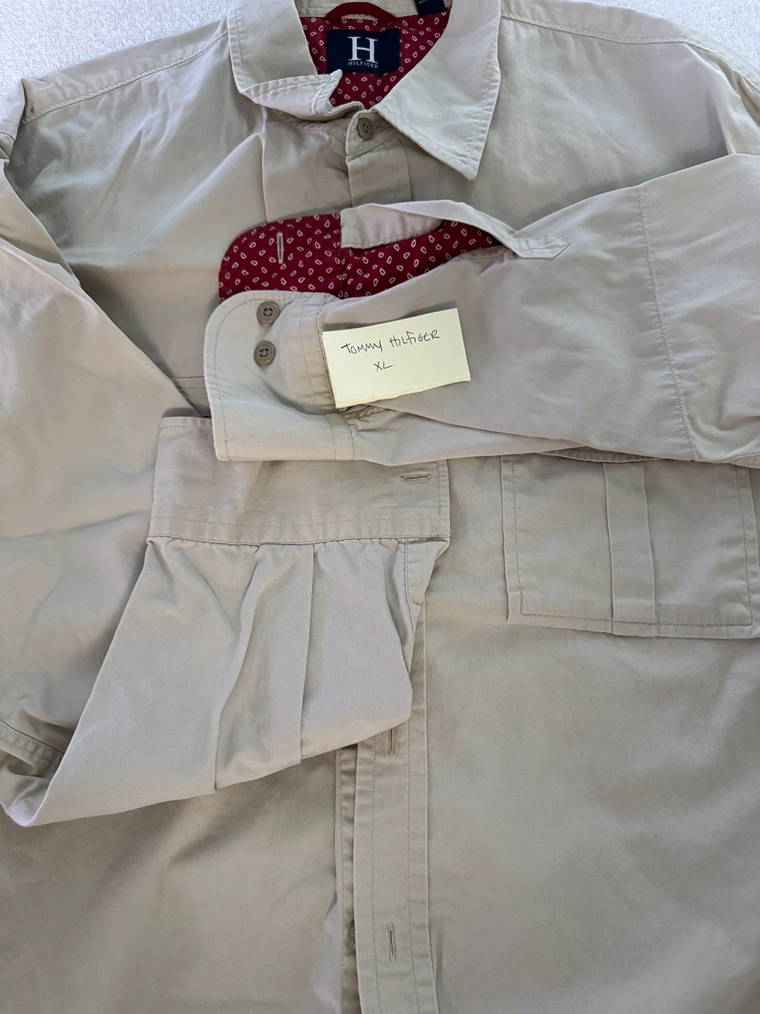 10Selling a Tommy Hilfiger button-down shirt in size XL. It's a light beige color with a red patterned interior lining. The shirt has a classic look and is in good condition