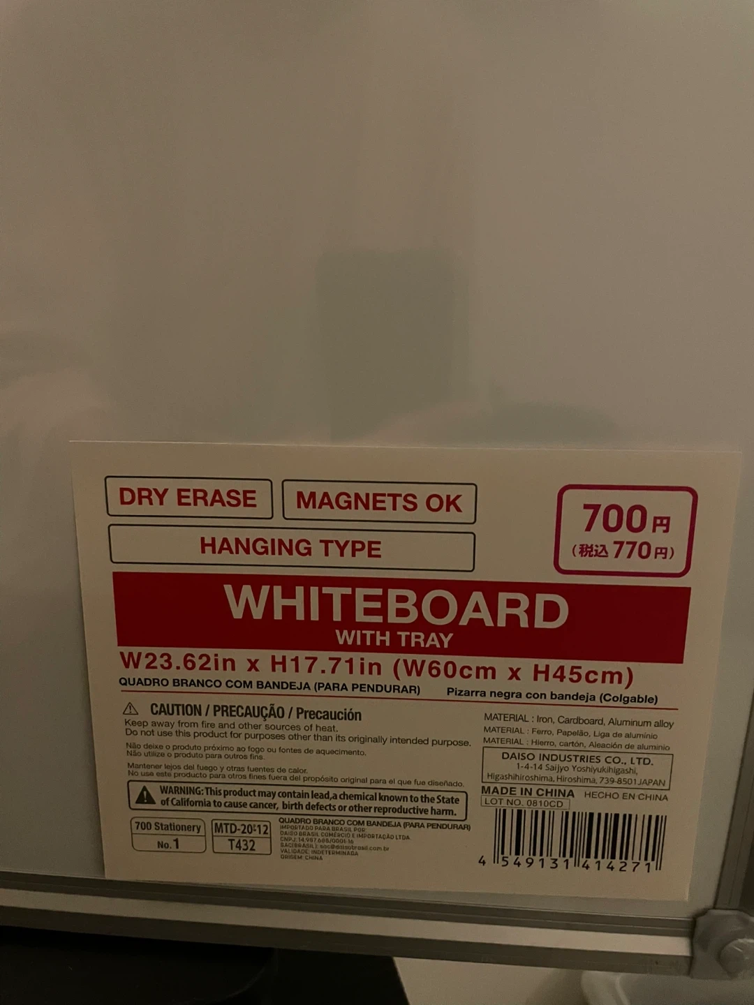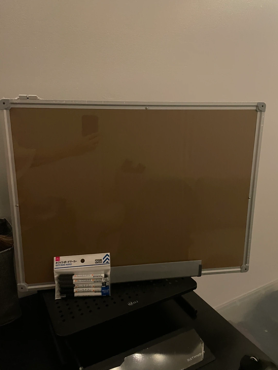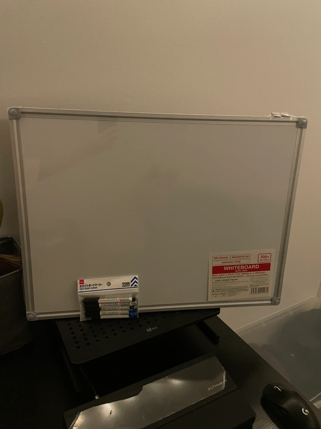 Selling a dry erase whiteboard that's in great condition! It's a convenient size at W23.62in x H17.71in (W60cm x H45cm). It's a hanging type whiteboard that is magnetic and comes with a tray. Also included are whiteboard markers