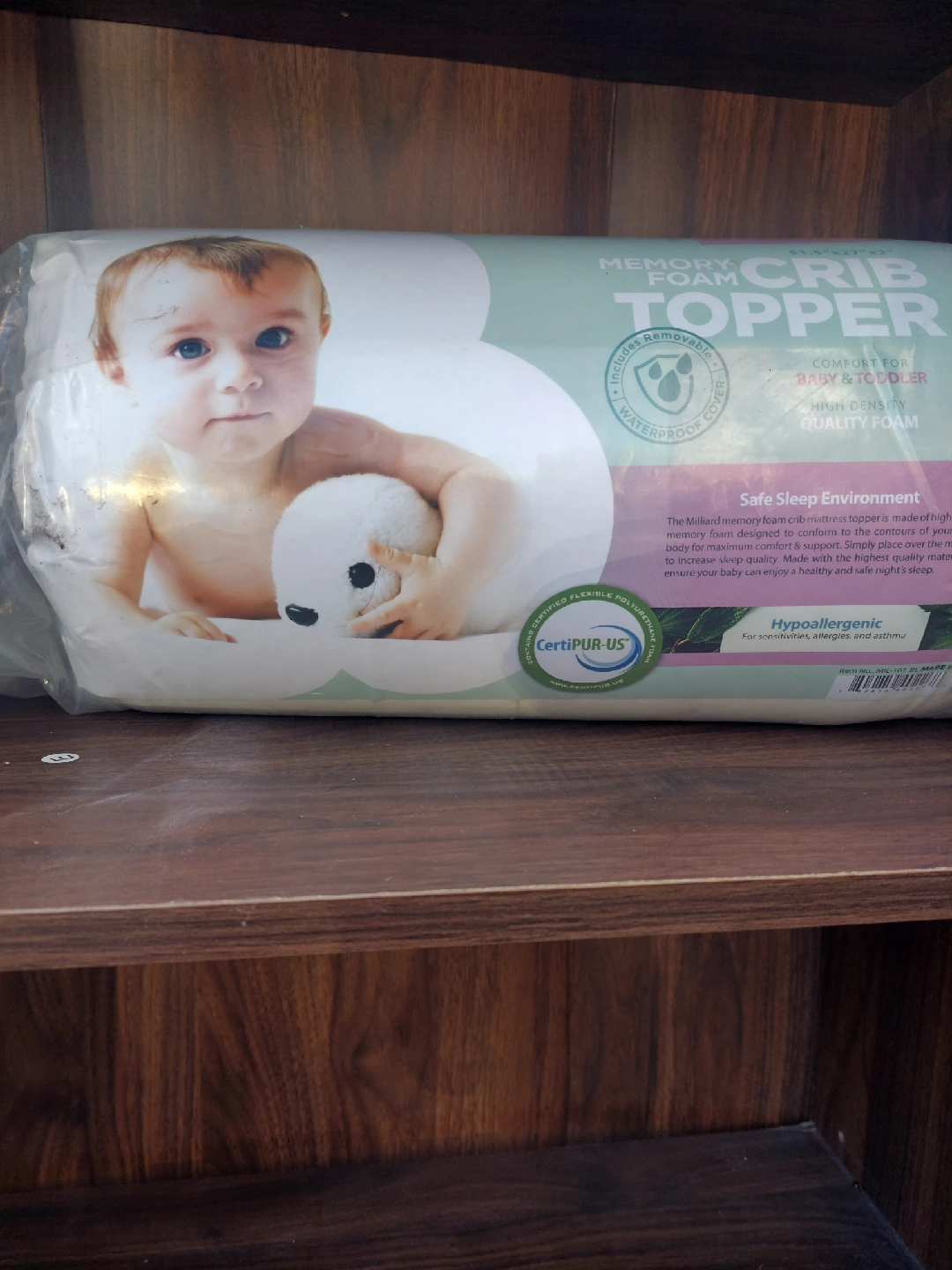 26I'm selling a brand new Milliard memory foam crib topper! It's designed for babies and toddlers, with high-density quality foam to ensure a safe and healthy night's sleep. The topper's dimensions are 51.5" x 27" x 2". It also features a removable waterproof cover, and is hypoallergenic for sensitivities, allergies, and asthma