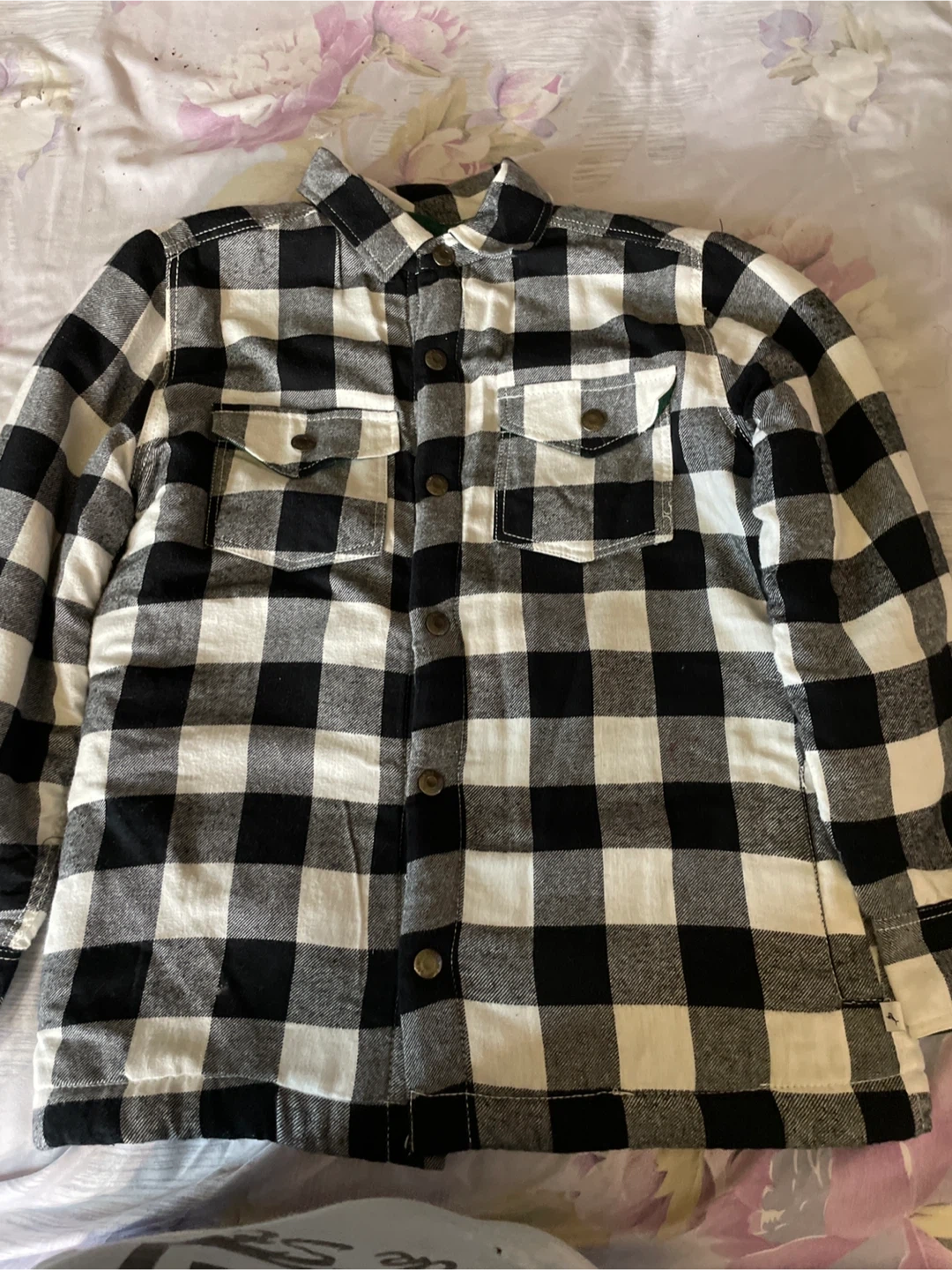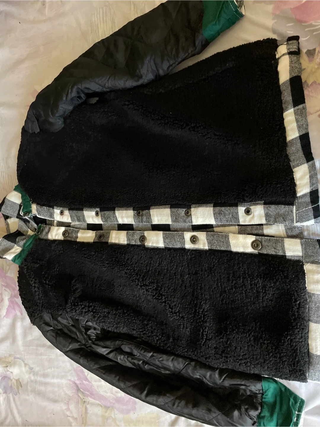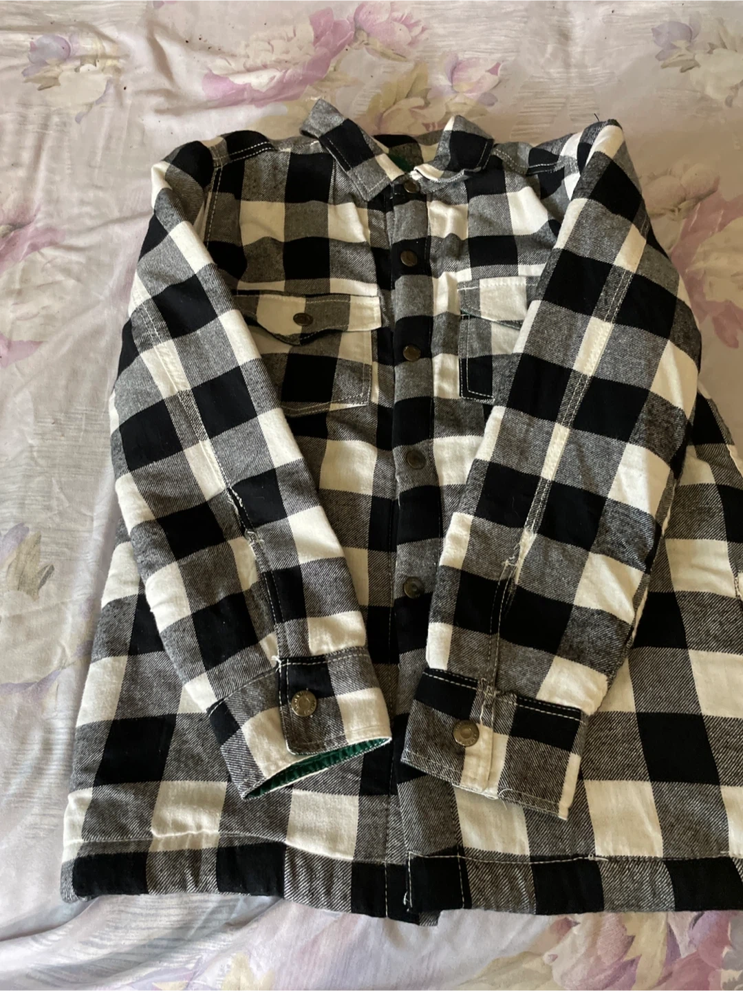 70Here's a cozy flannel shirt jacket! It features a black and white plaid pattern on the outside and a soft, black sherpa-like lining on the inside. It also has a padded layer for extra warmth. Perfect for layering during the colder months for boys ages 10 or 11 or 12
