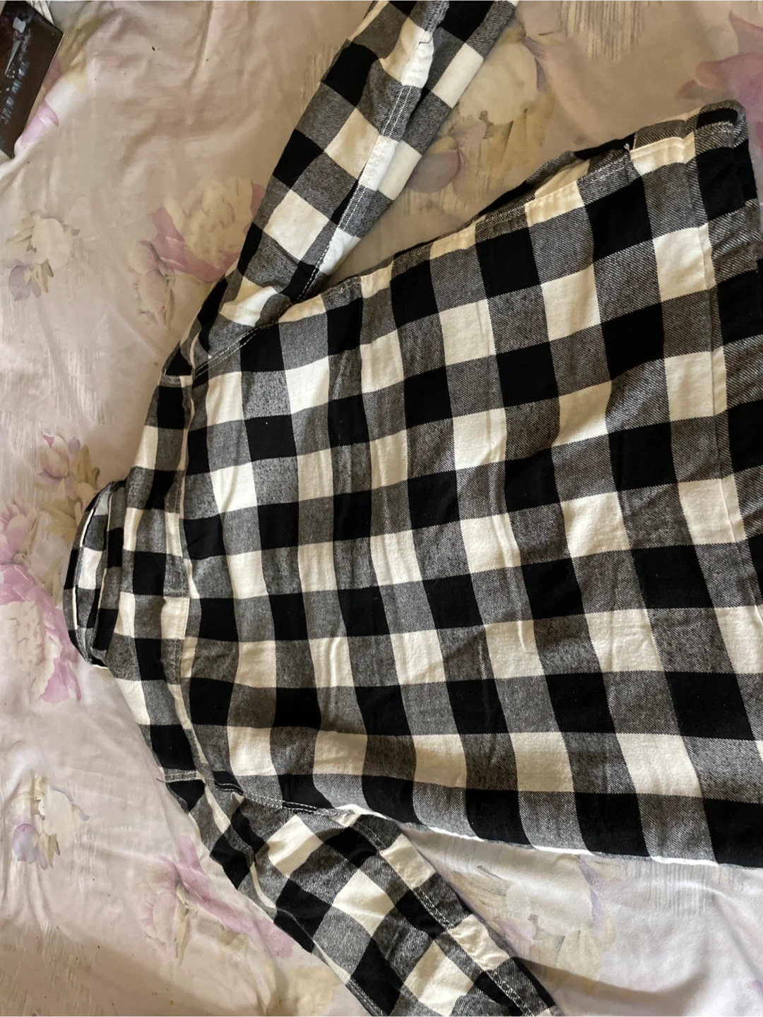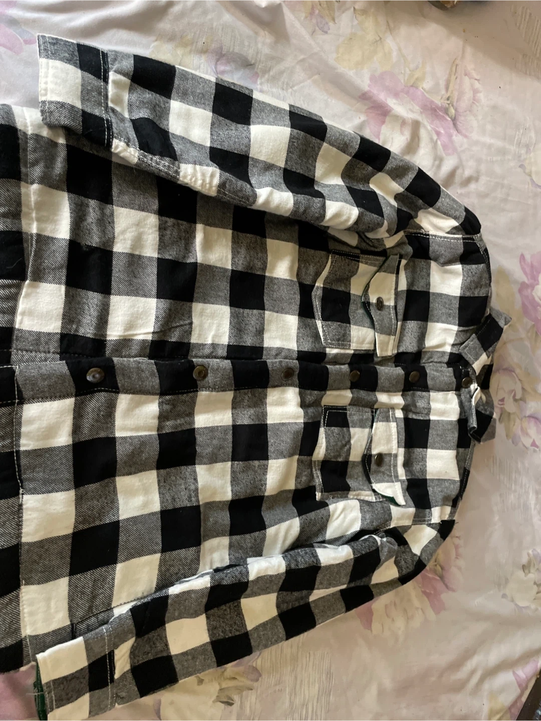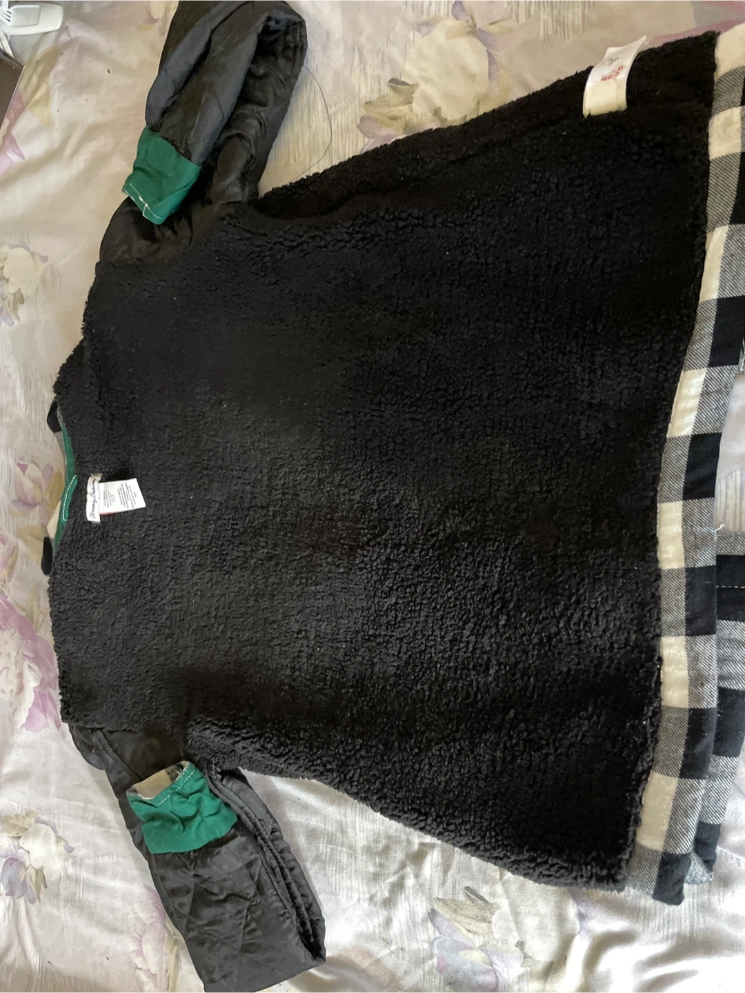 70Here's a cozy flannel shirt jacket! It features a black and white plaid pattern on the outside and a soft, black sherpa-like lining on the inside. It also has a padded layer for extra warmth. Perfect for layering during the colder months for boys ages 10 or 11 or 12