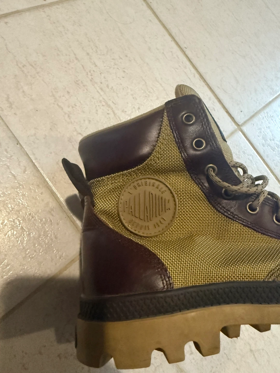 Selling a pair of Palladium waterproof boots in men's size 8.5 (US). These boots are durable and stylish, perfect for any weather condition! They feature a leather and textile upper, with a rugged rubber sole for great traction.