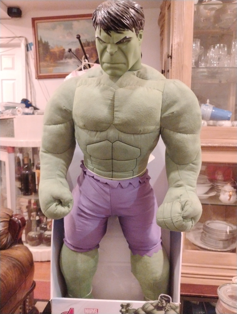 60Selling a large Hulk plush toy from Marvel's Avengers! This soft and cuddly Hulk is ready for a new home. He's got his signature green skin and purple shorts. Perfect for any Marvel fan!