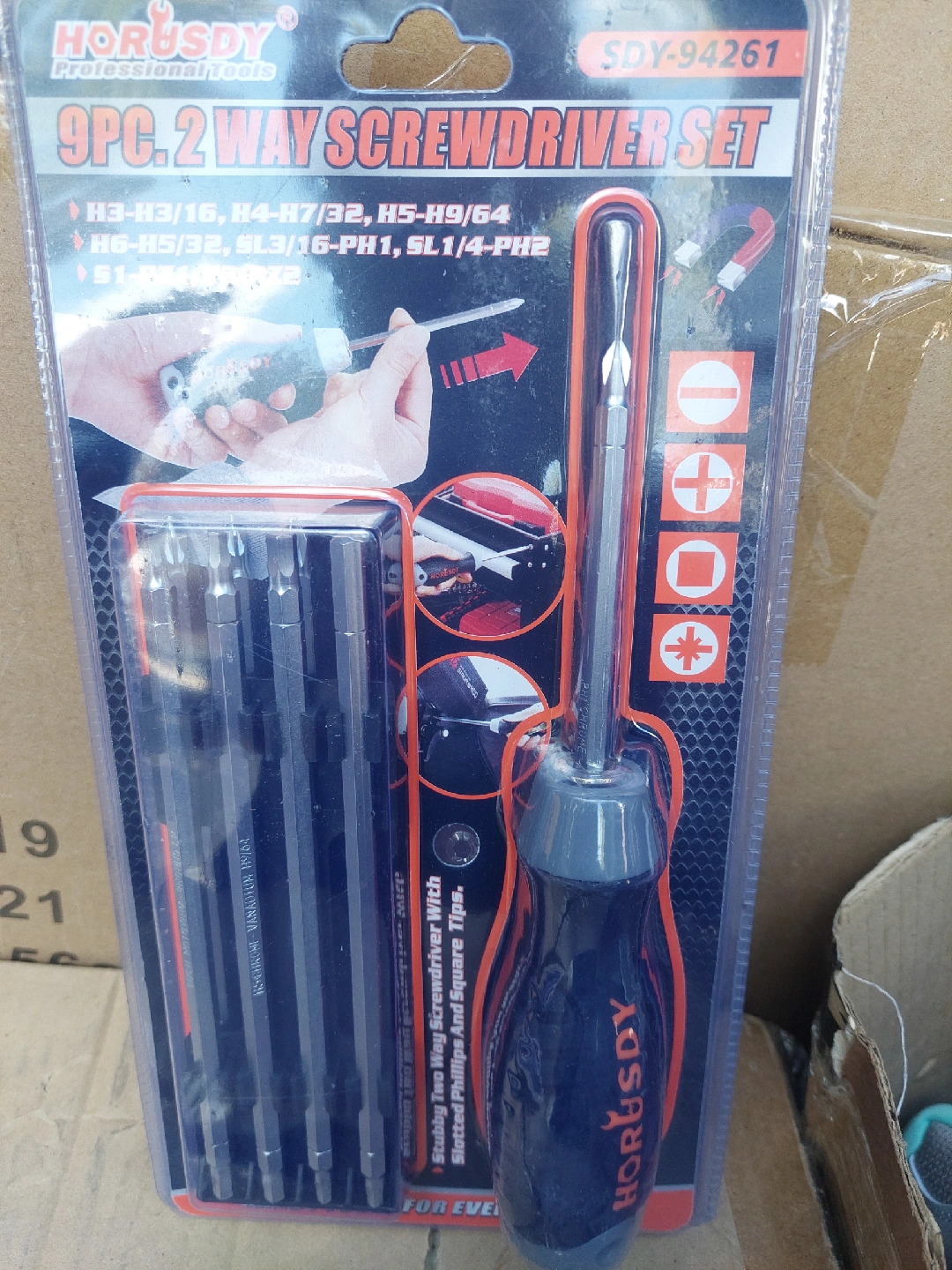 26Selling a HORUSDY 9-piece 2-way screwdriver set! This set includes various sizes like H3-H3/16, H4-H7/32, H5-H9/64, H6-H5/32, SL3/16-PH1, and SL1/4-PH2. It's a stubby two-way screwdriver with slotted Phillips and square tips.
