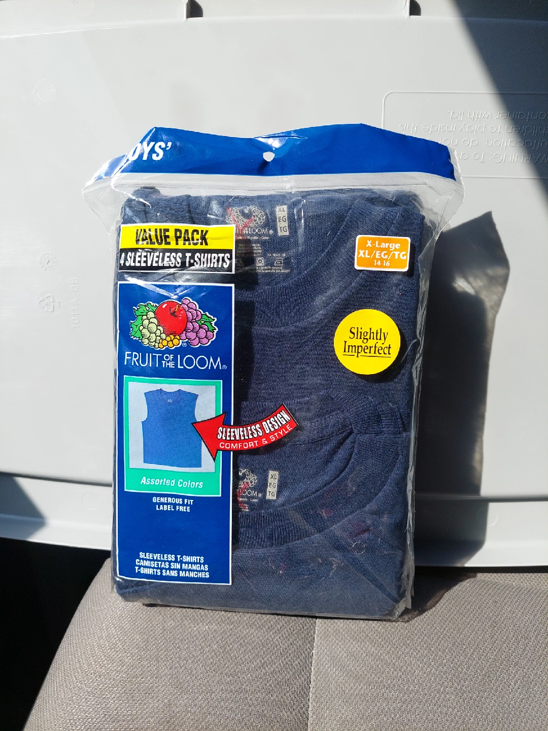 26Selling a pack of 4 Fruit of the Loom sleeveless t-shirts for boys! They're size XL (14-16). The pack says "Value Pack" and "Sleeveless Design, Comfort & Style" so they're made to be comfy. Please note that the package indicates the shirts are "Slightly Imperfect".