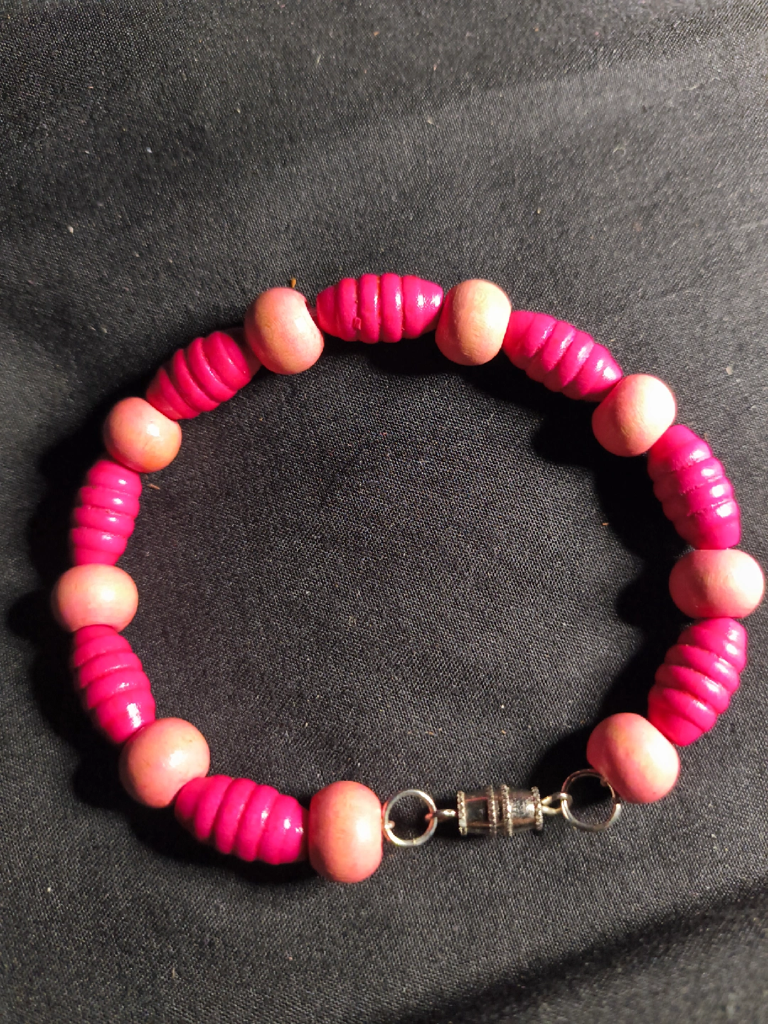 Here's a cute bracelet with pink and beige wooden beads! It has a silver-tone clasp. It's in good condition and ready for a new home