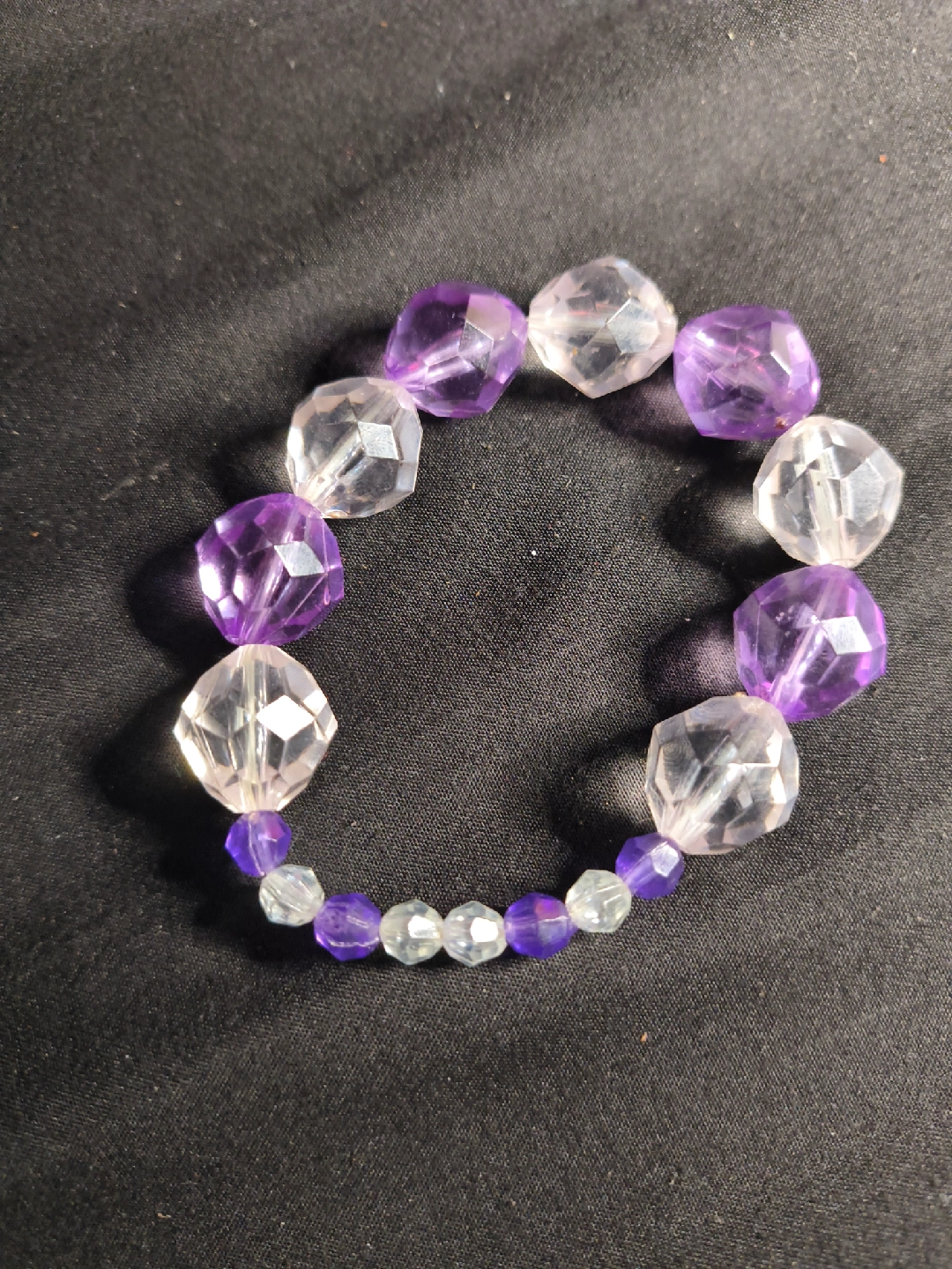 Selling a cute beaded bracelet! It features alternating purple and clear faceted beads, with smaller accent beads in between. Perfect for adding a pop of color to any outfit