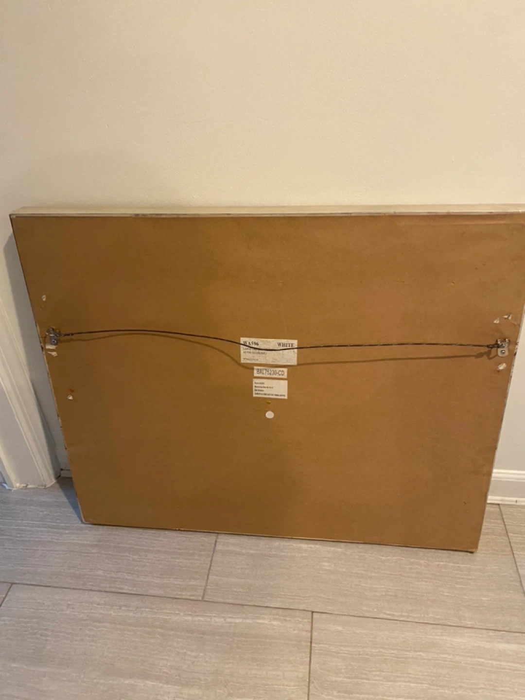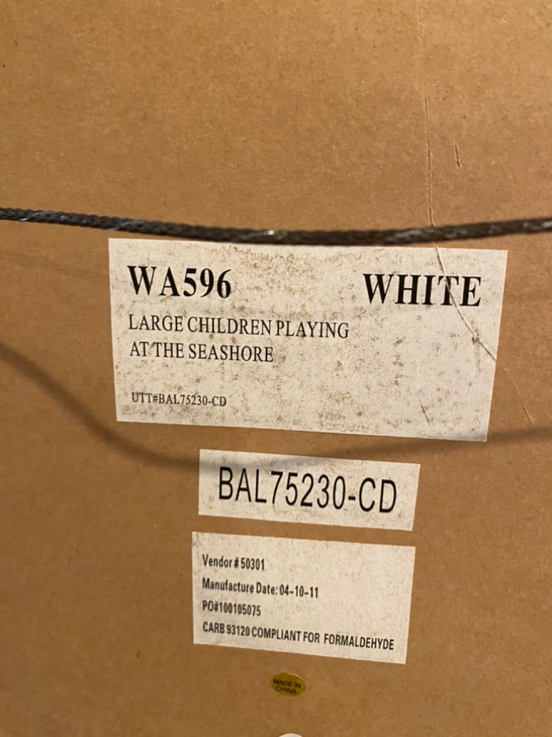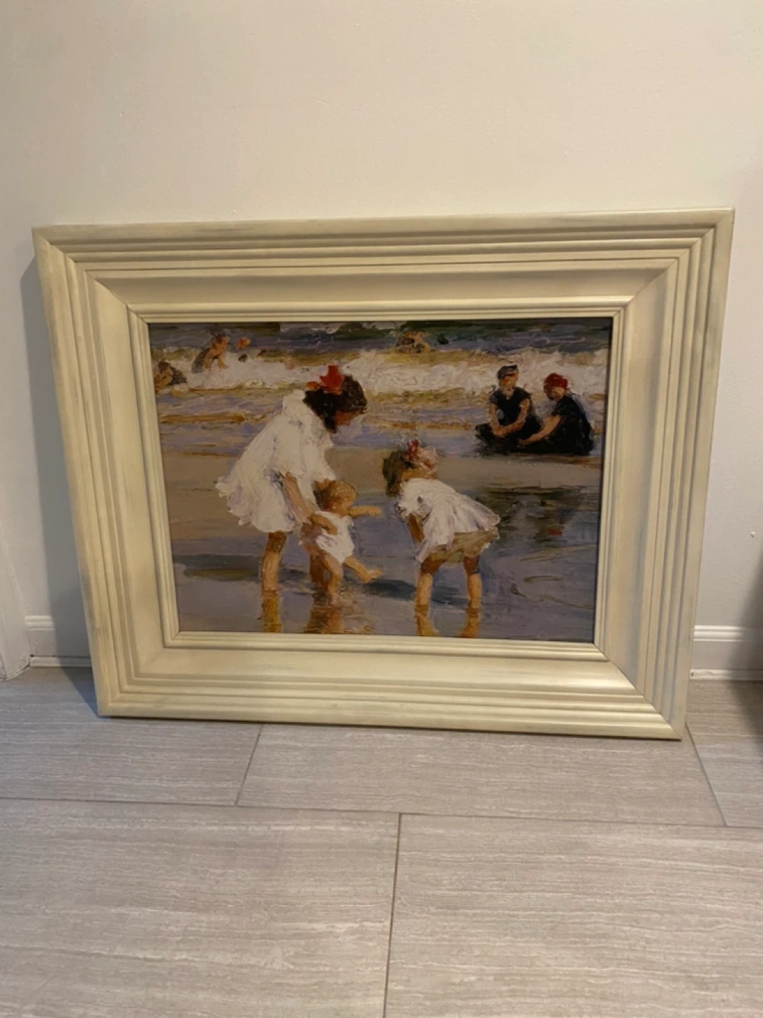 Framed art featuring children playing at the seashore. The frame is white. It's a nice piece to add to any room