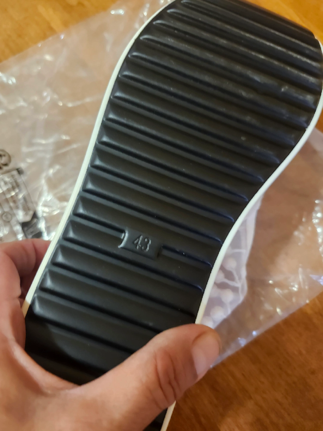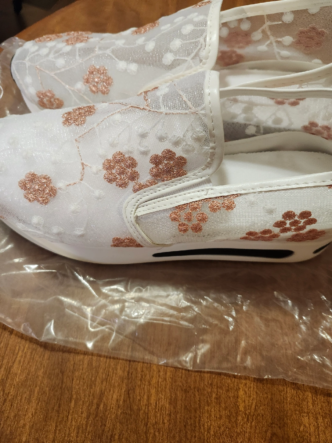 65These are a pair of white slip-on shoes with a floral design. They appear to be in good condition and are a size 43. The sole is black with a ribbed pattern.