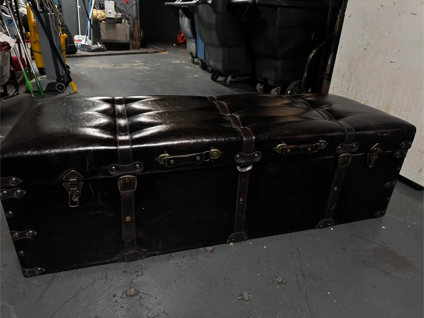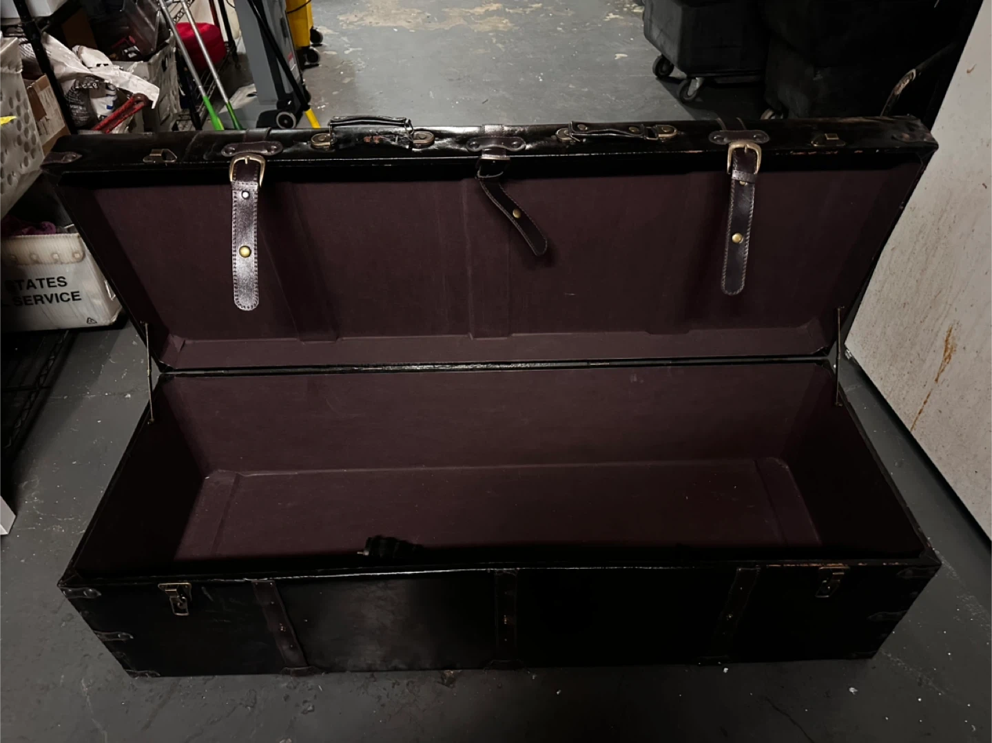 Selling a vintage-style storage trunk. It's in good condition and perfect for adding a touch of classic style to your home while providing extra storage space. The trunk has a dark finish and features decorative buckles and straps. Would be great as a coffee table or for storing blankets!