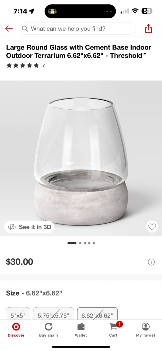 Selling a Threshold large round glass terrarium with a cement base! It's perfect for indoor or outdoor use and measures 6.62" x 6.62". Originally bought for $30