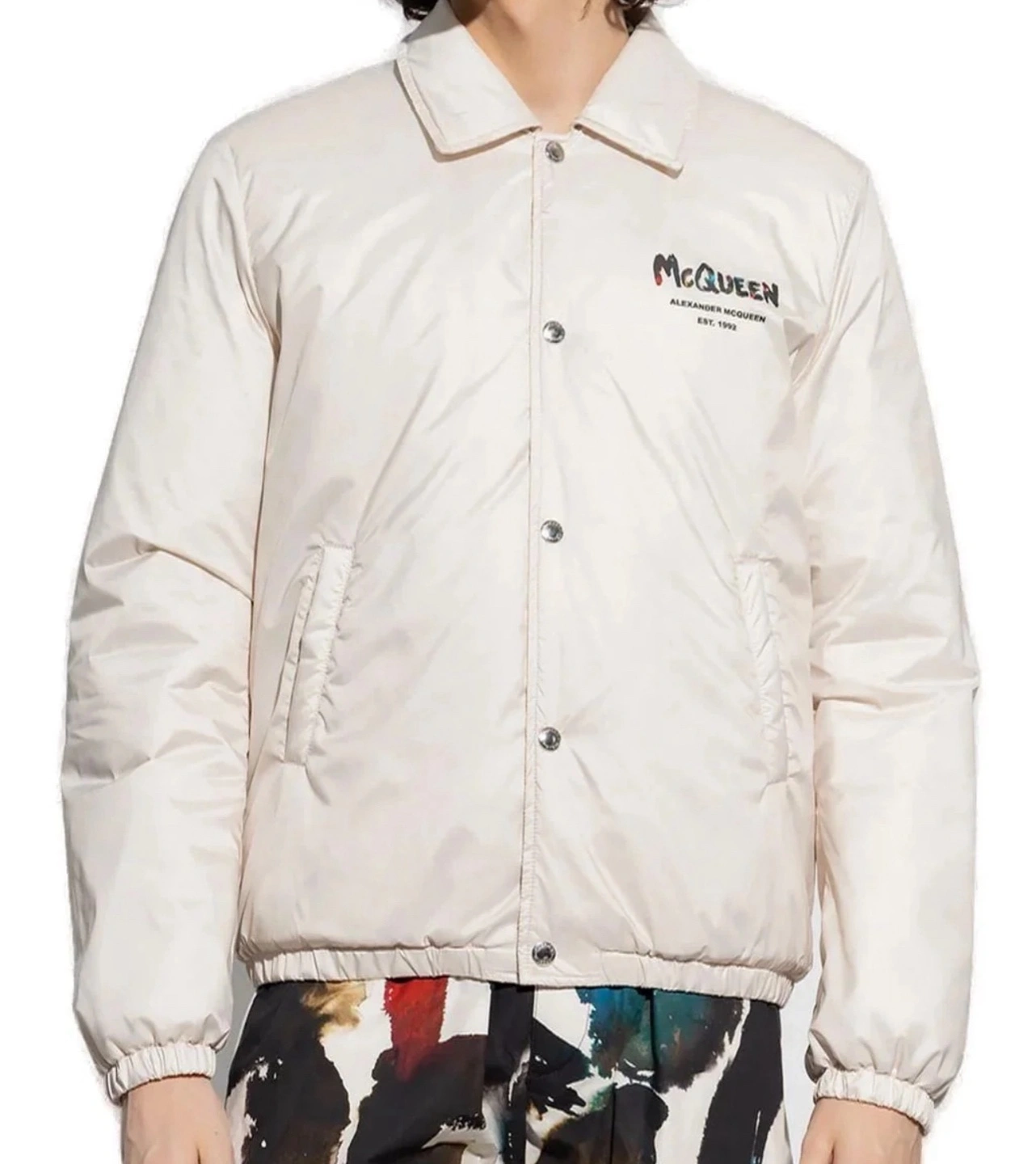 Selling a stylish Alexander McQueen coach jacket in a neutral beige color. It features the McQueen logo on the front and a larger, colorful logo on the back. This jacket is perfect for adding a touch of designer flair to your wardrobe! Simply beautiful. With tag, never w