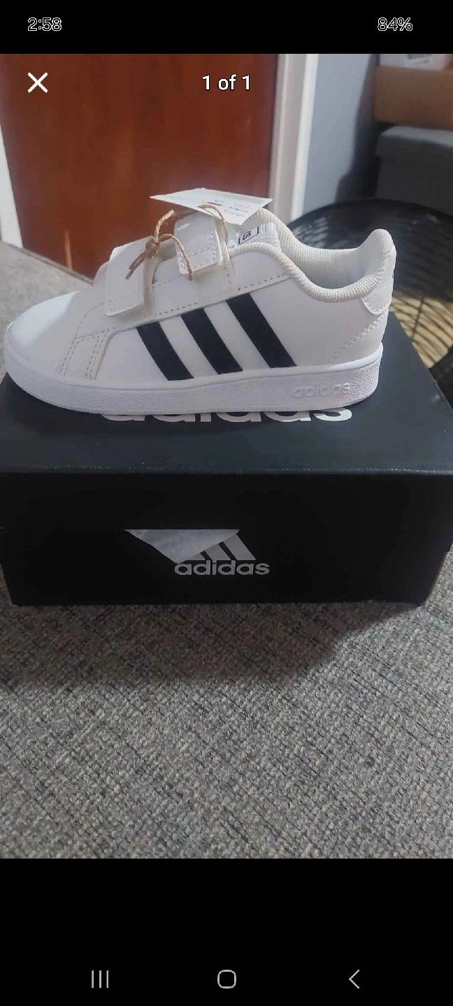 These Adidas Grand Court 2.0 kids shoes are brand new and ready for a new owner! They're a classic white color with the iconic black stripes. Comes with the original box size 9 kids