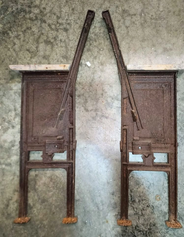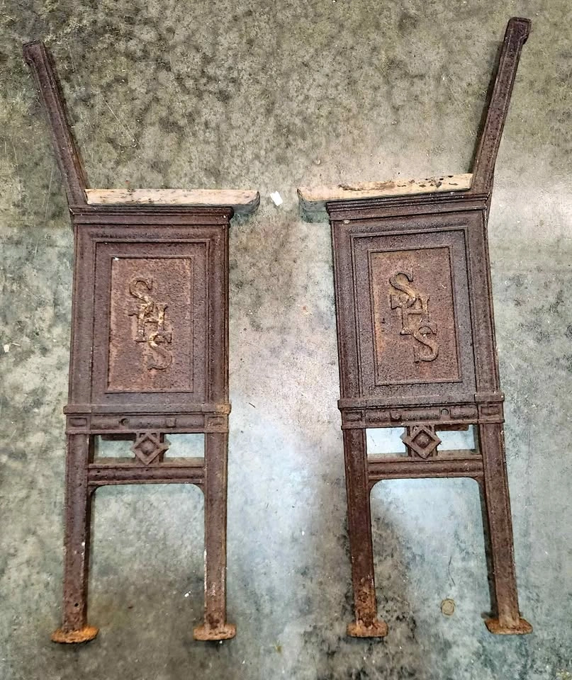 77Antique Art Deco Cast Iron Theater/auditorium Seat Ends (1900-1950). Architectural salvage. They look to potentially come from a high-school SHS initials on the side. No cracks in Iron, would make a great frame for a planter box. Local pickup only due to weight.