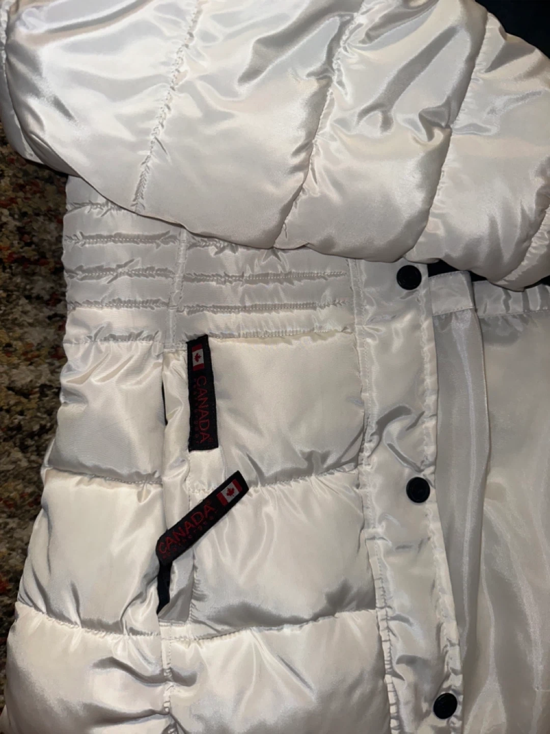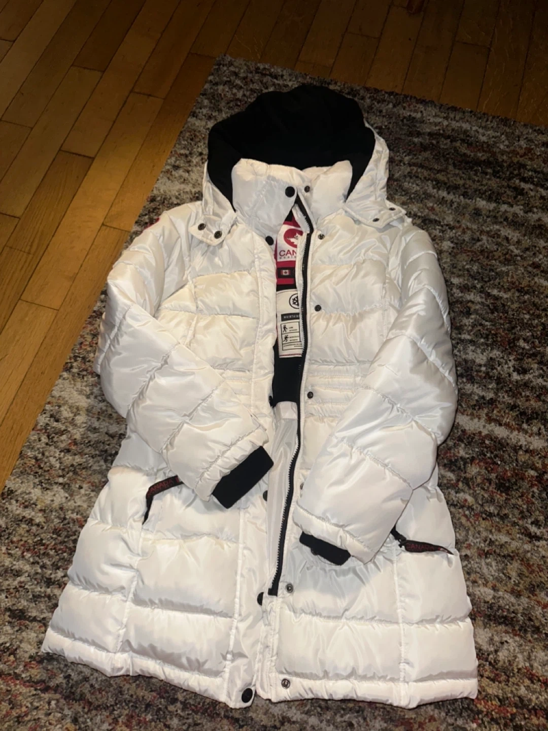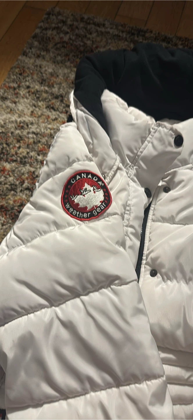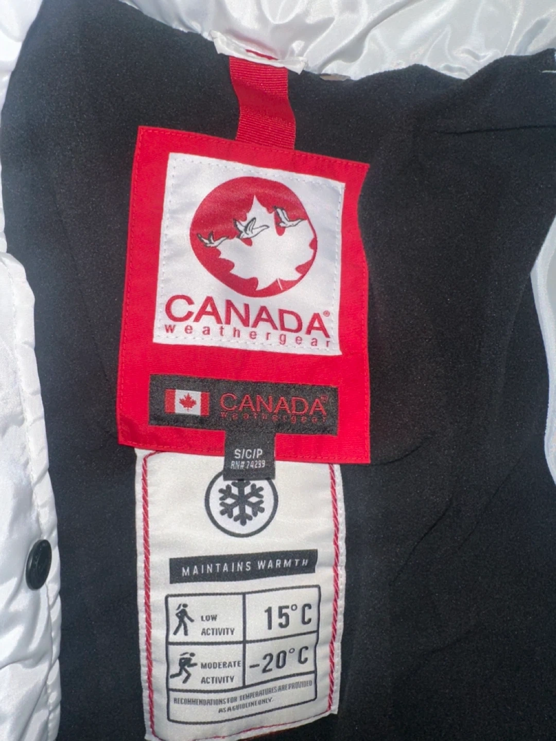 15Selling a Canada Weathergear puffer jacket in size S/C. The jacket is white and designed to maintain warmth in low activity at 15°C and moderate activity at -20°C