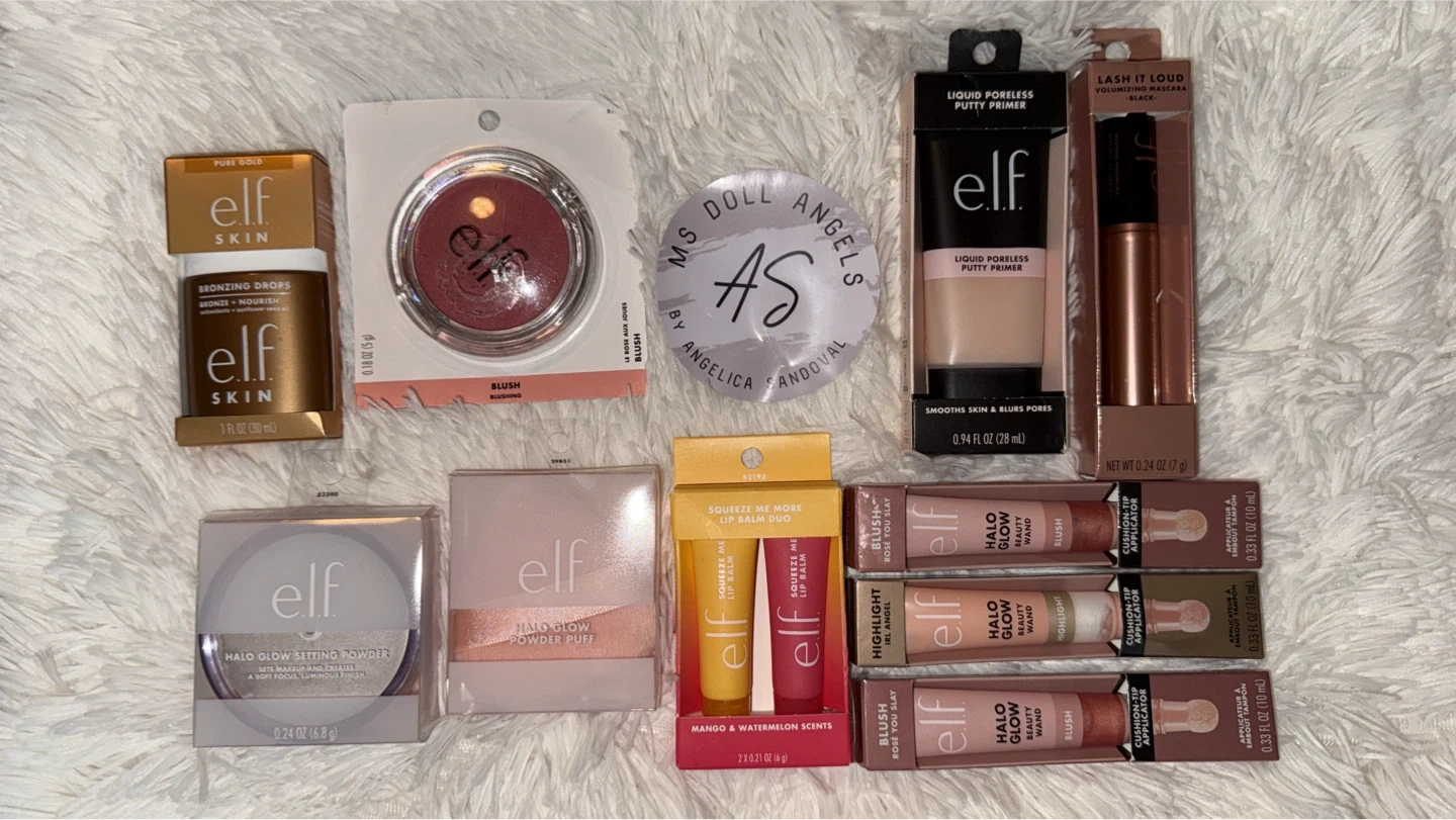 I'm selling a bundle of new e.l.f. cosmetics! Included are: - e.l.f. Skin Bronzing Drops in Pure Gold (1 fl oz) - e.l.f. Halo Glow Setting Powder (0.24 oz) - e.l.f. Halo Glow Powder Puff - e.l.f. Blush - e.l.f. Liquid Poreless Putty Primer (0.94 fl oz) - e.l.f. Lash It Loud Volumizing Mascara in Black (0.24 oz) - e.l.f. Squeeze Me More Lip Balm Duo in Mango & Watermelon Scents (2 x 0.21 oz) - e.l.f. Halo Glow Beauty Wand (0.33 fl oz)