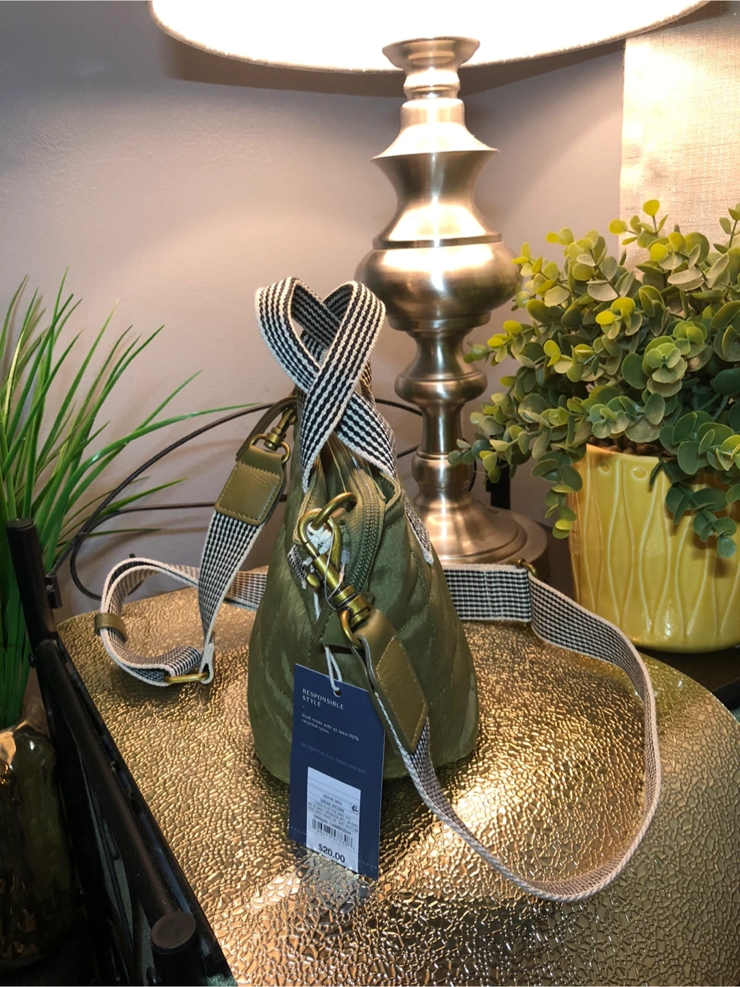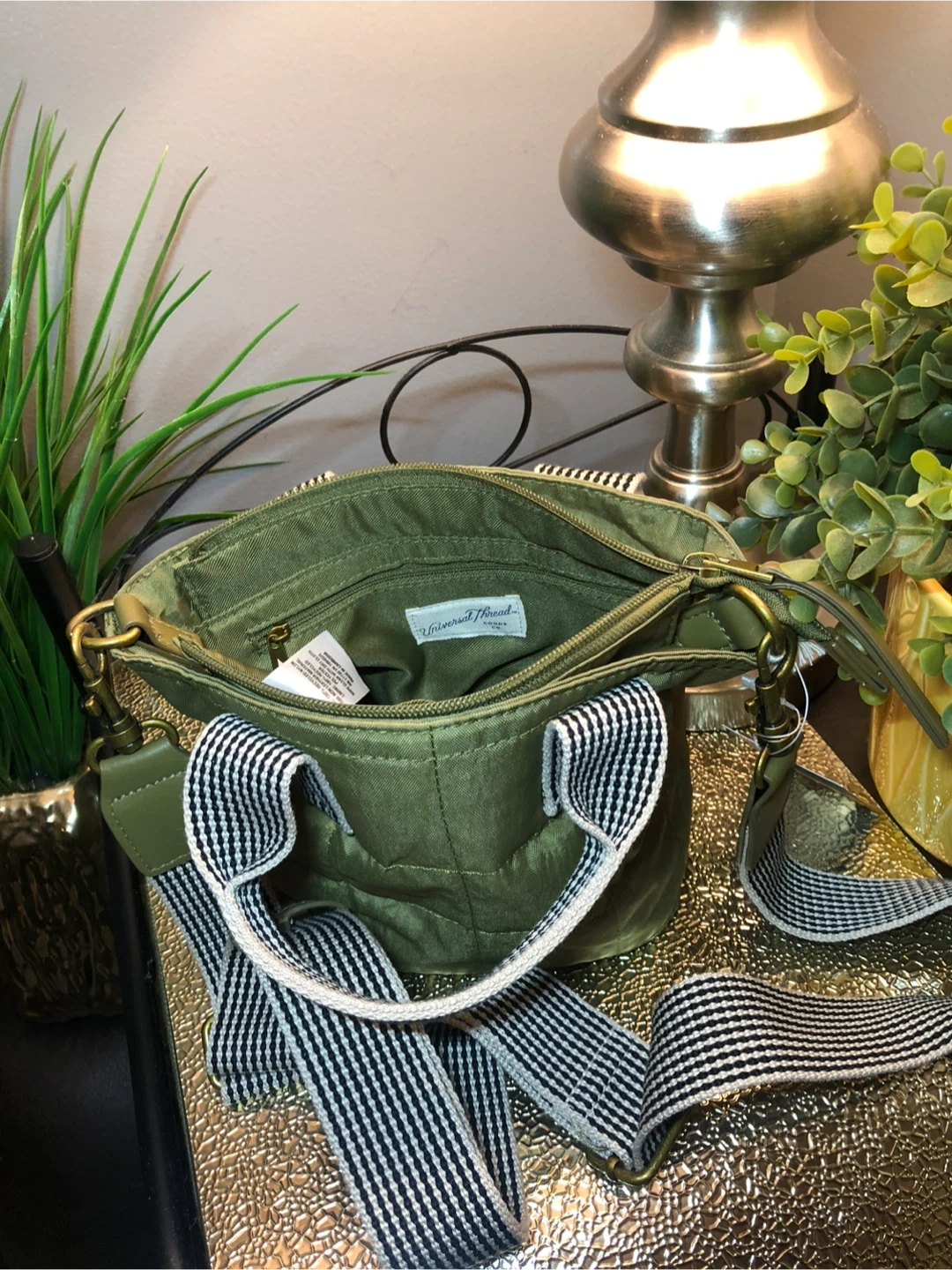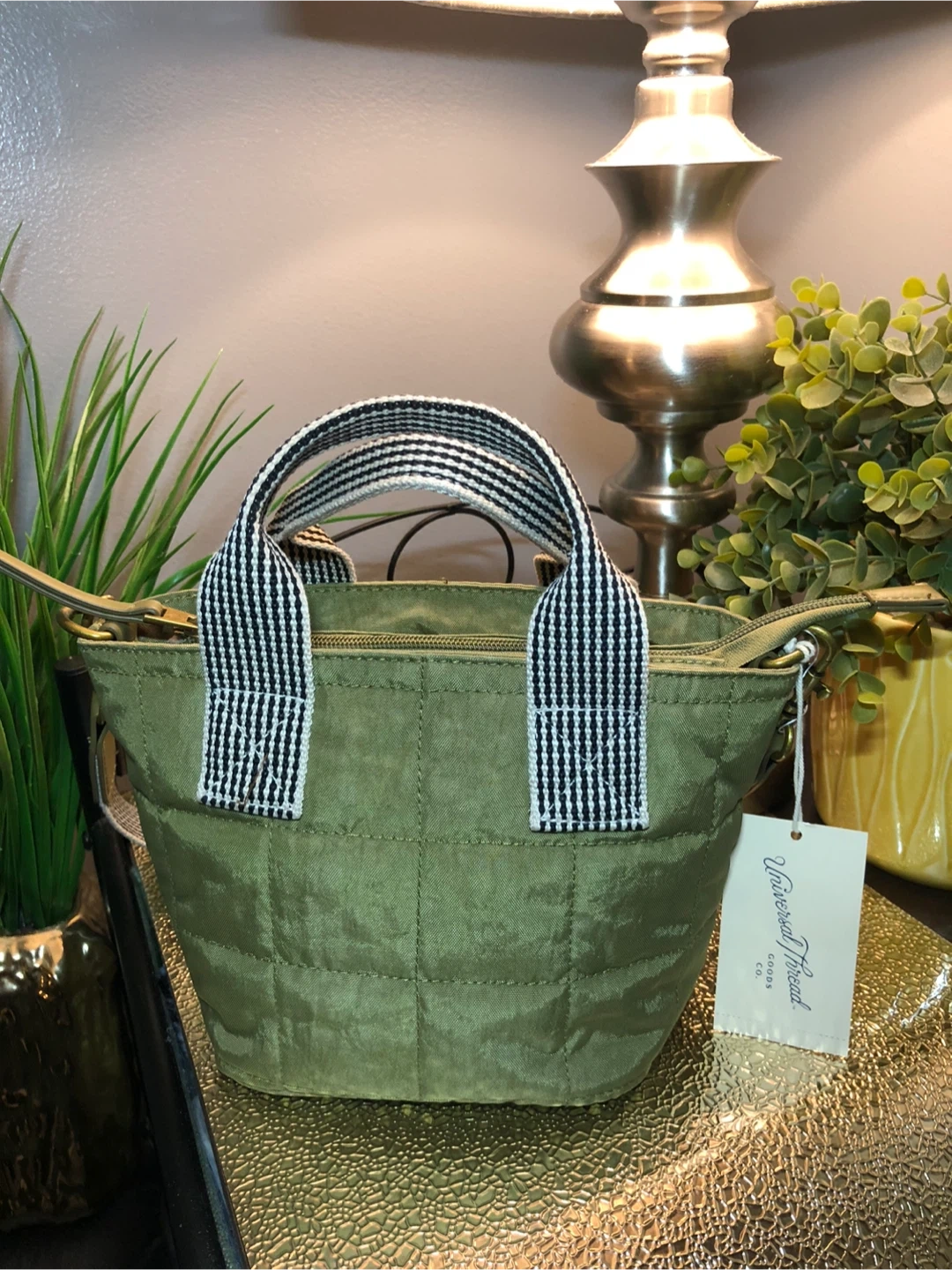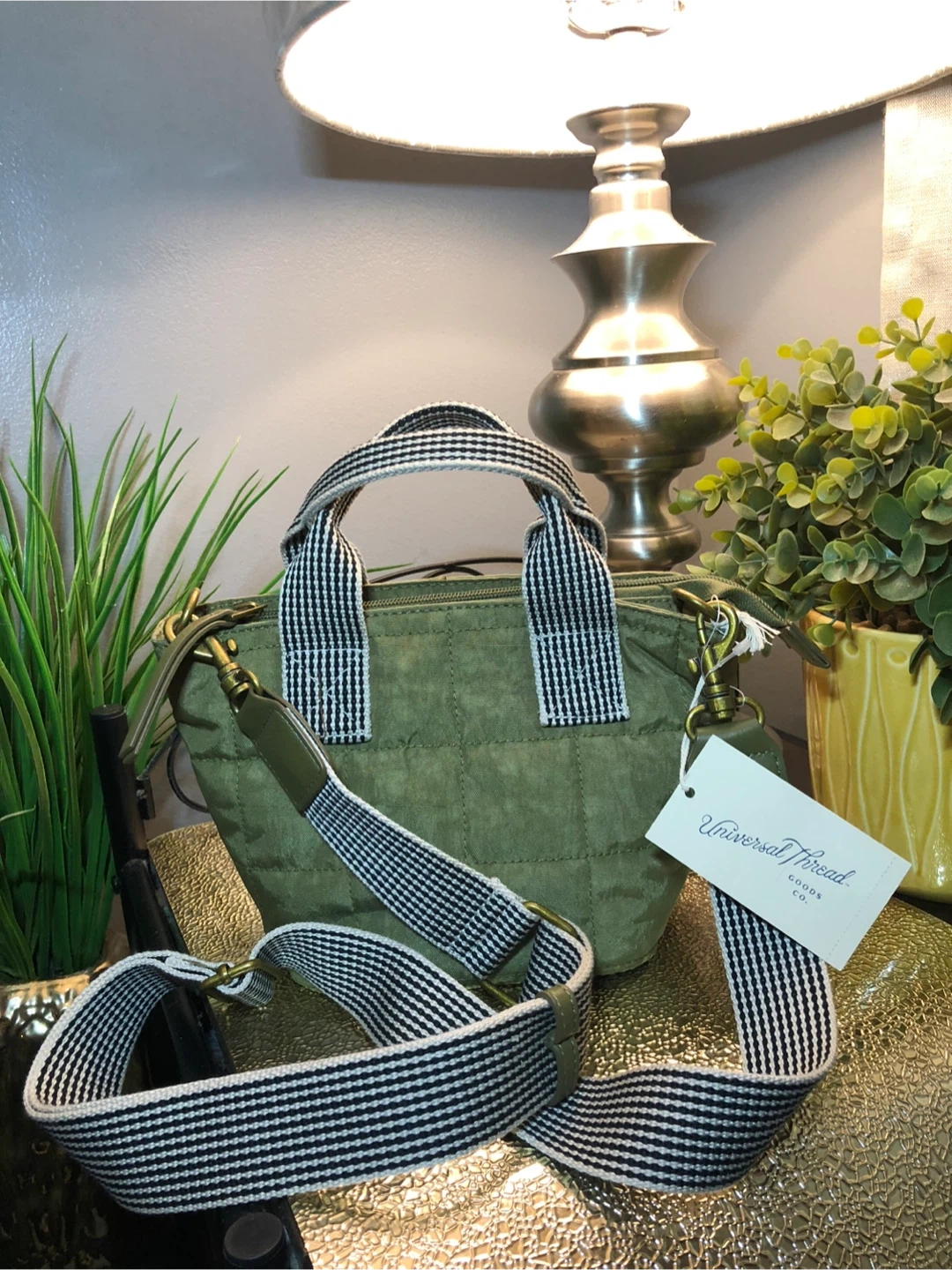 15This is an olive green quilted tote bag from Universal Thread. It features black and white striped handles and a removable shoulder strap. The bag is in great condition and ready for a new home!
