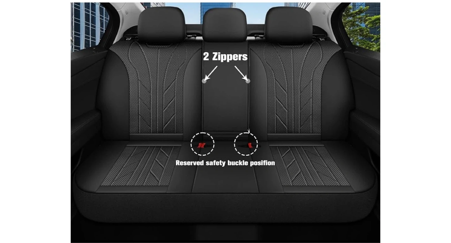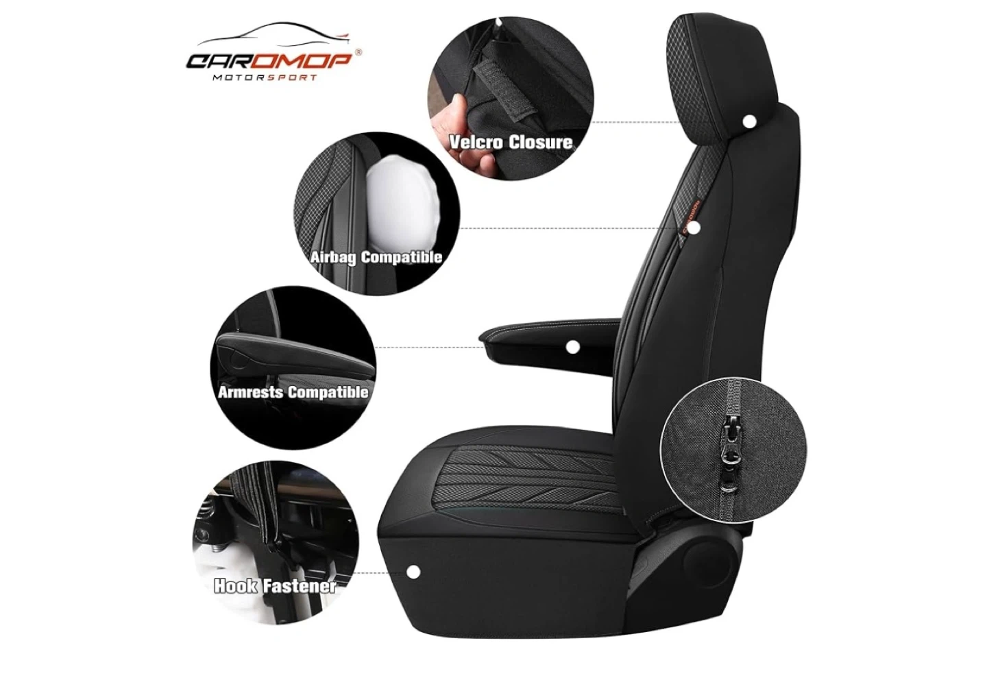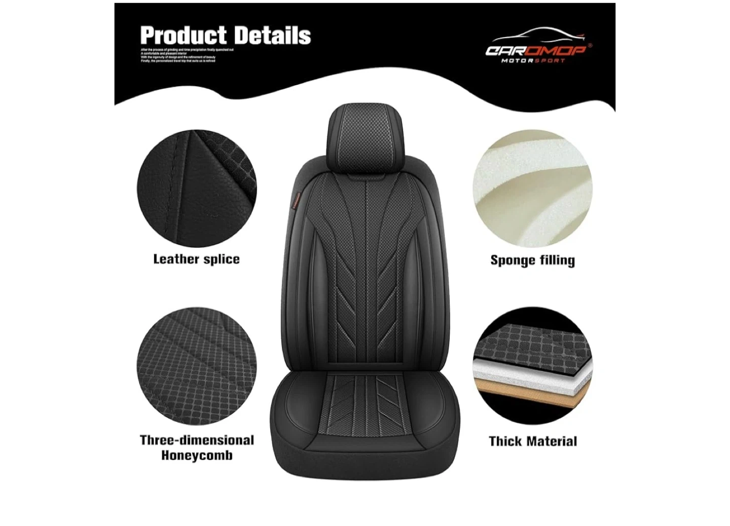 53These CarOmop car seat covers feature a leather splice and a three-dimensional honeycomb design. They're made with thick material and sponge filling for added comfort. The covers are airbag compatible and come with velcro closures and hook fasteners for easy installation