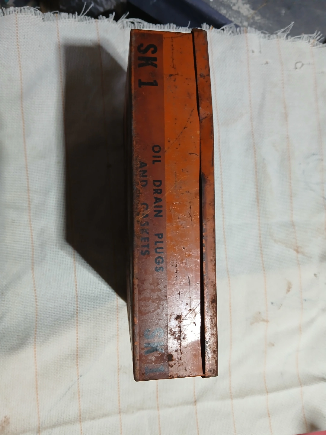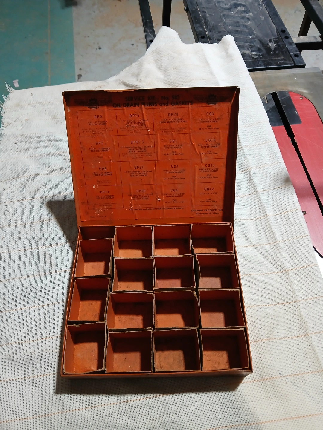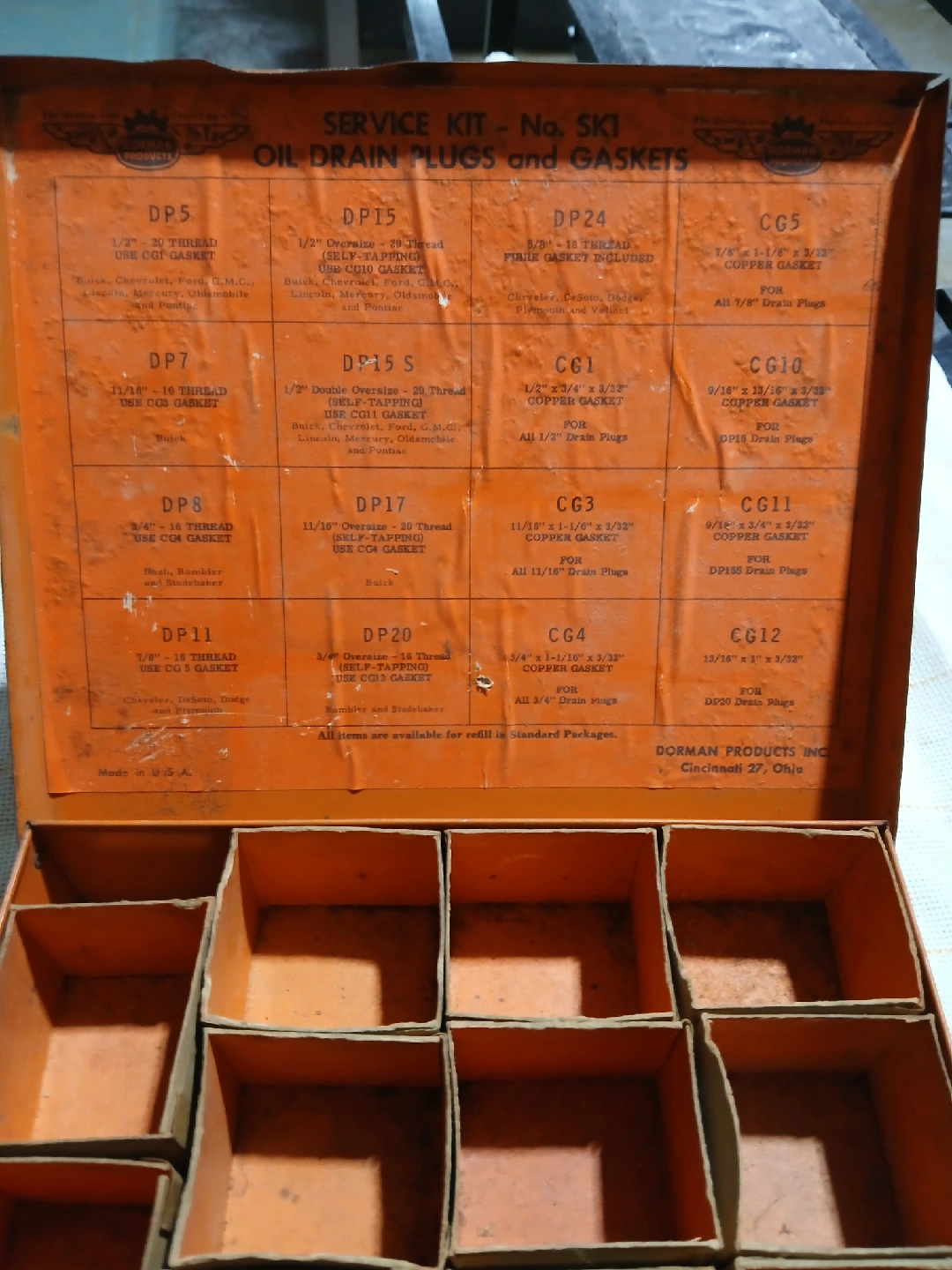 Selling a vintage Dorman Products Service Kit No. SK1 for Oil Drain Plugs and Gaskets. The box has an orange color and features labeled compartments for various plug and gasket sizes. It includes part numbers like DP5, DP15, DP24, CG5, DP7, DP15 S, CG1, CG10, DP8, DP17, CG3, CG11, DP11, DP20, CG4, and CG12. The box is marked with 'DORMAN PRODUCTS INC. Cincinnati 27, Ohio'.