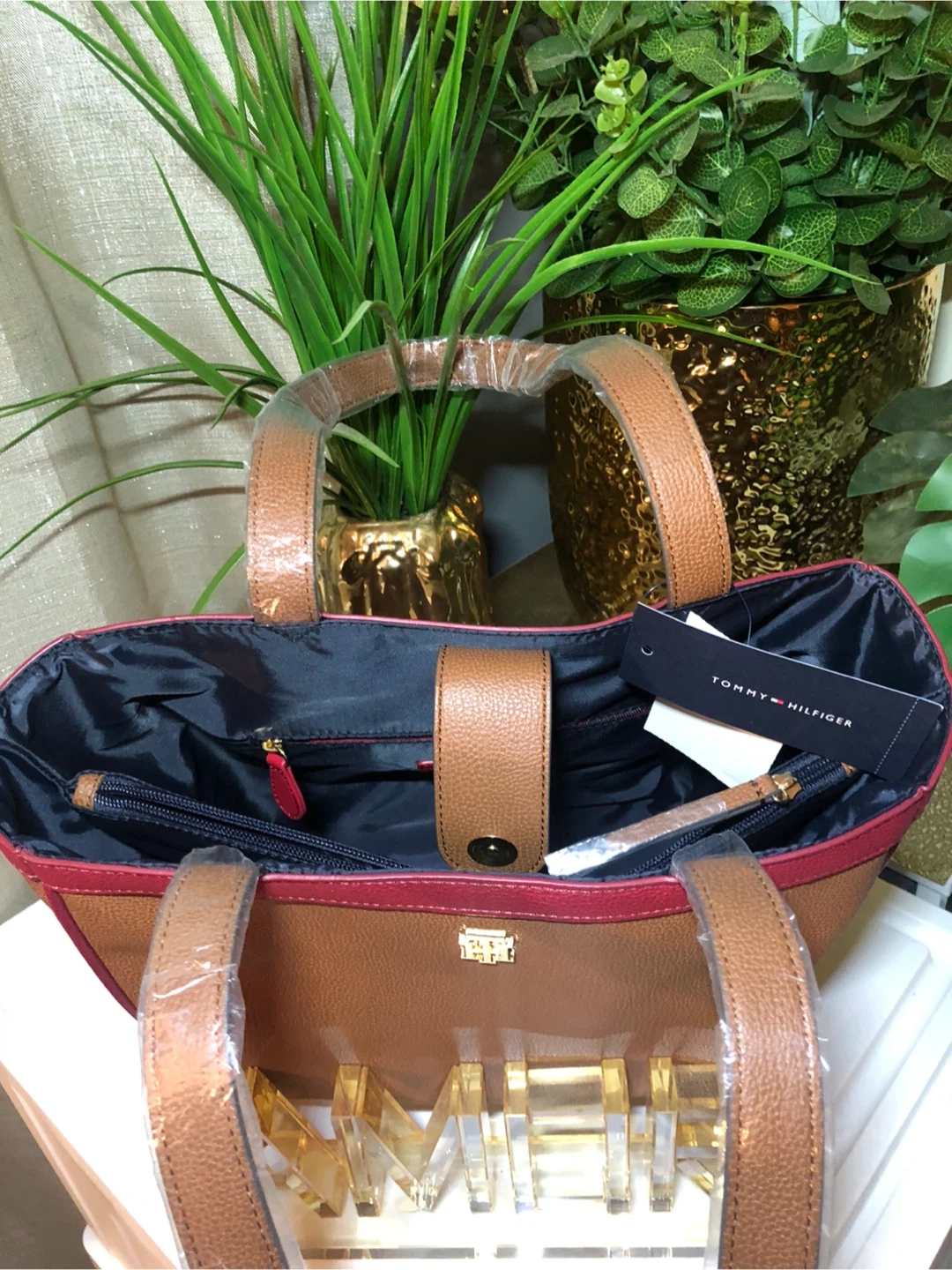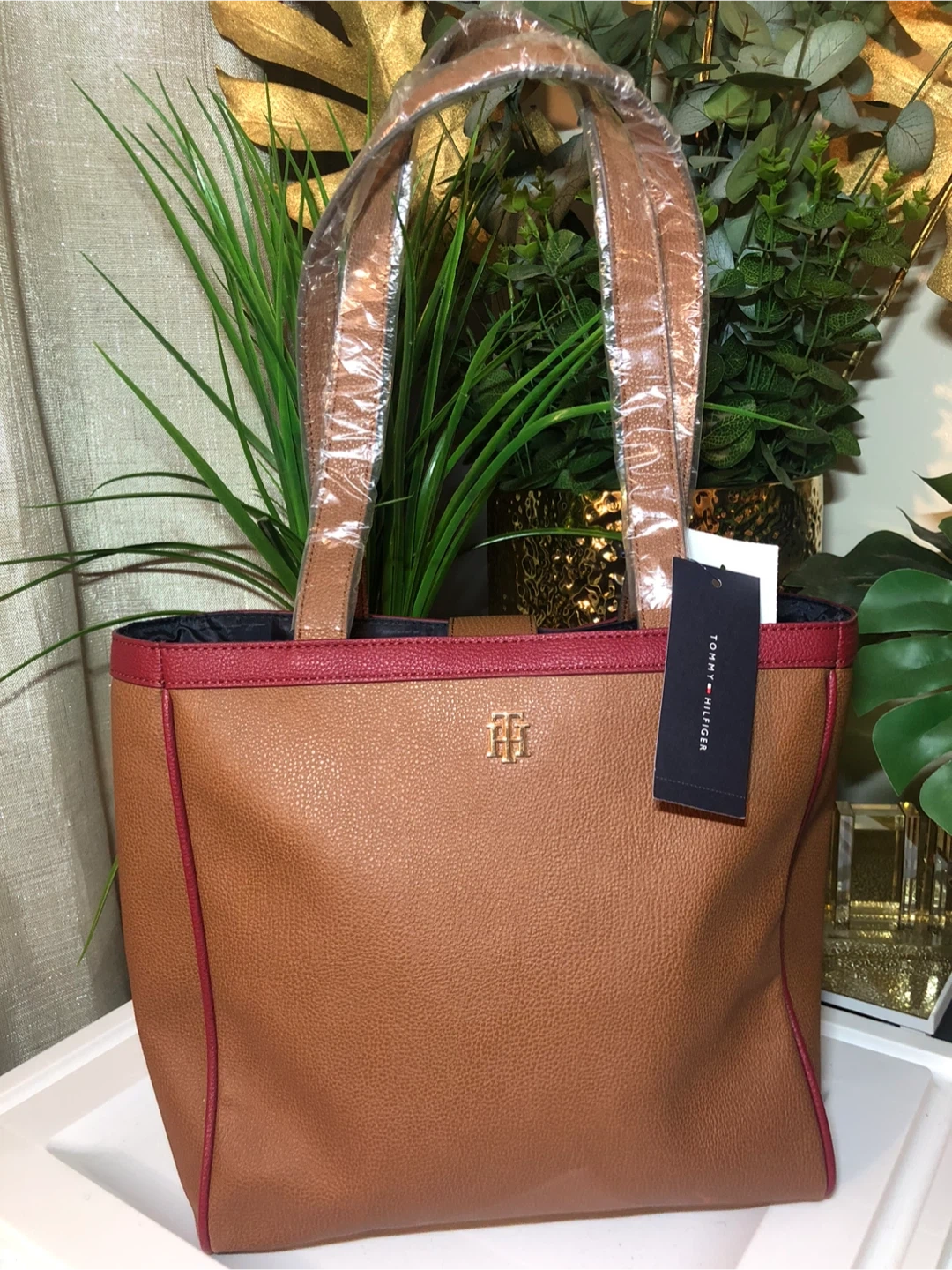 15This is a brand new Tommy Hilfiger tote bag with tags still attached! It's a beautiful brown color with red trim. Perfect for everyday use or as a stylish accessory