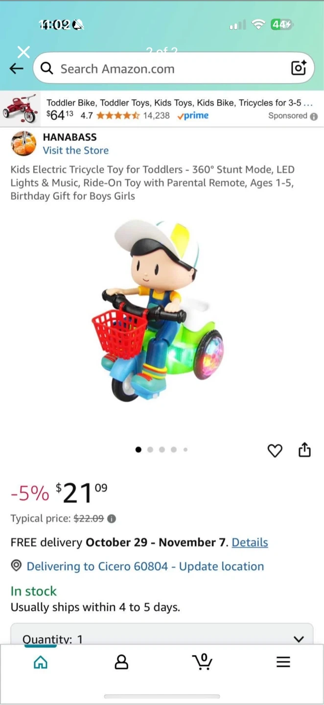 Selling a HANABASS Kids Electric Tricycle Toy for toddlers! It features a 360° stunt mode, LED lights, and music. It's a ride-on toy with a parental remote, suitable for ages 1-5. Originally priced at $22.09!