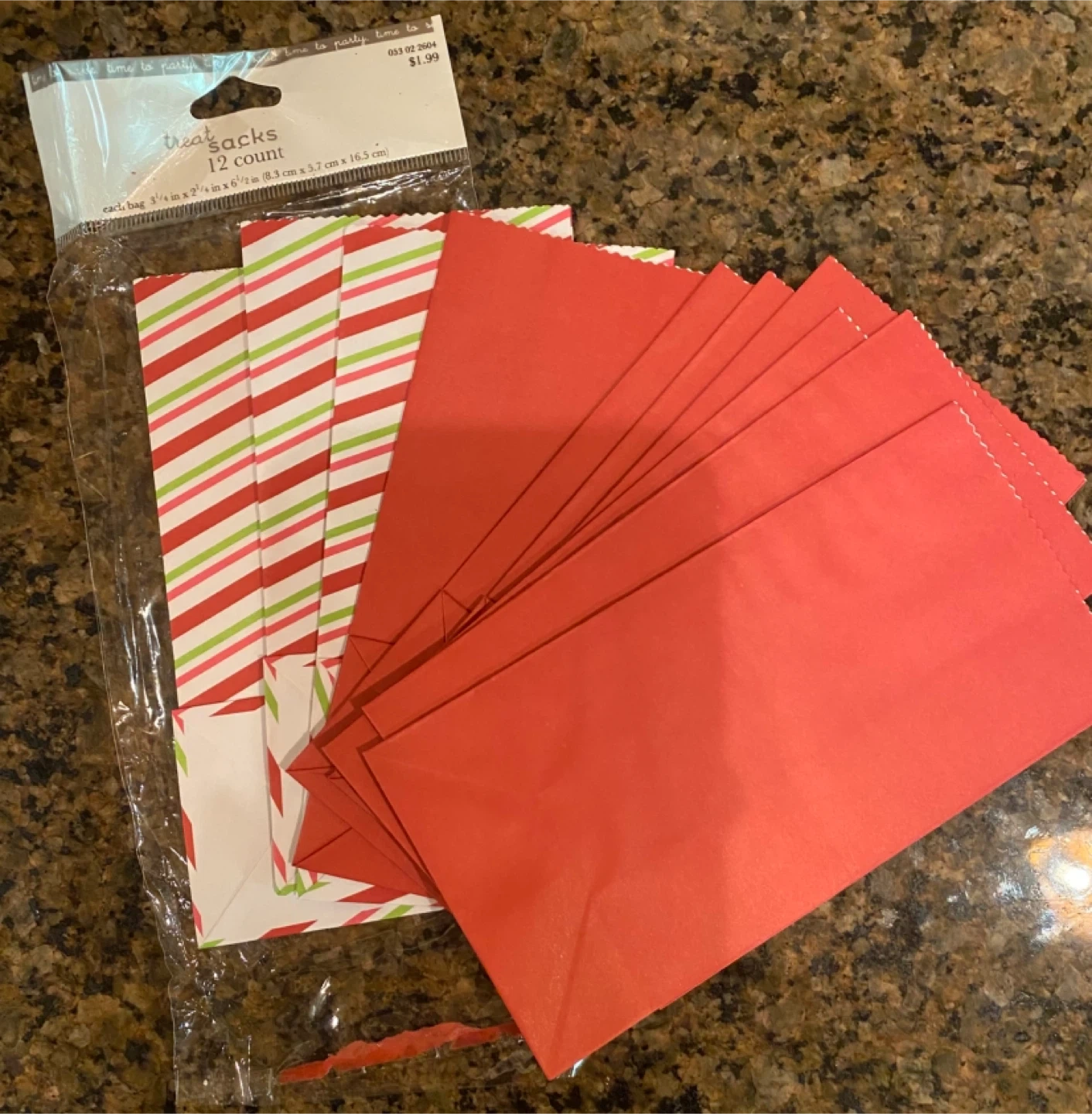 10 small paper treat bags. 3 striped and 7 red.