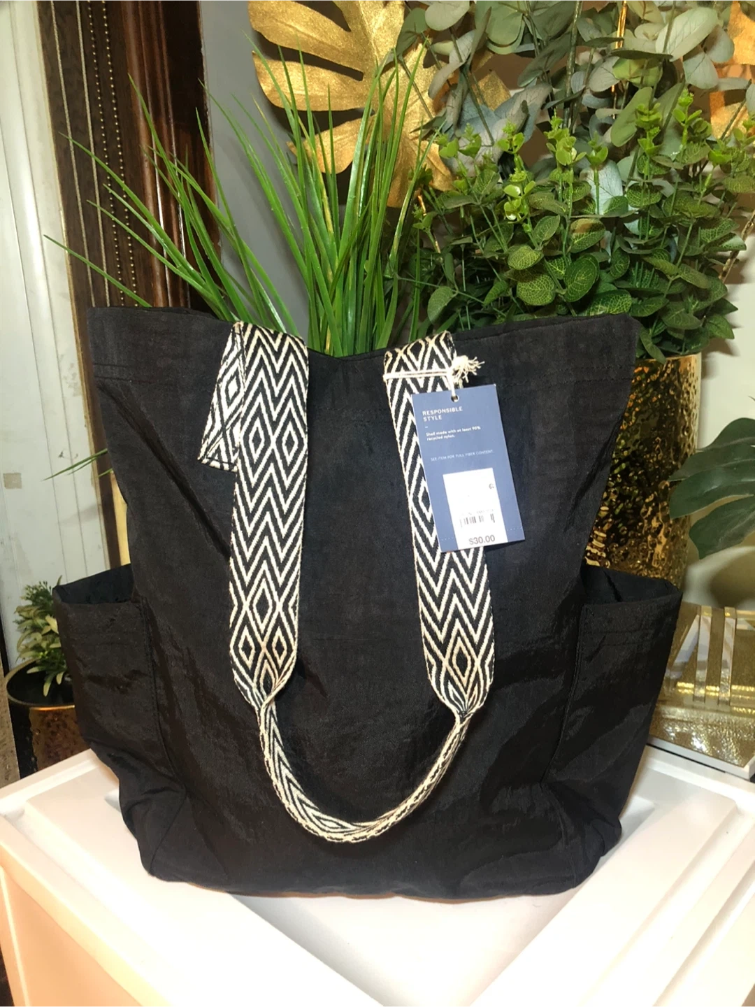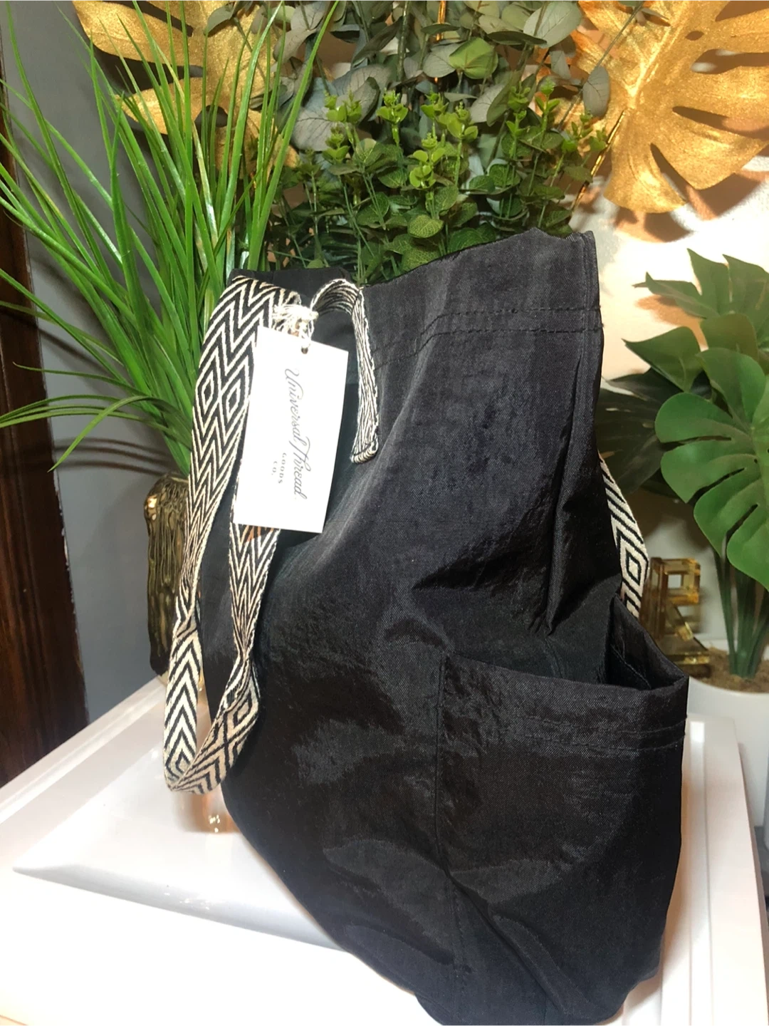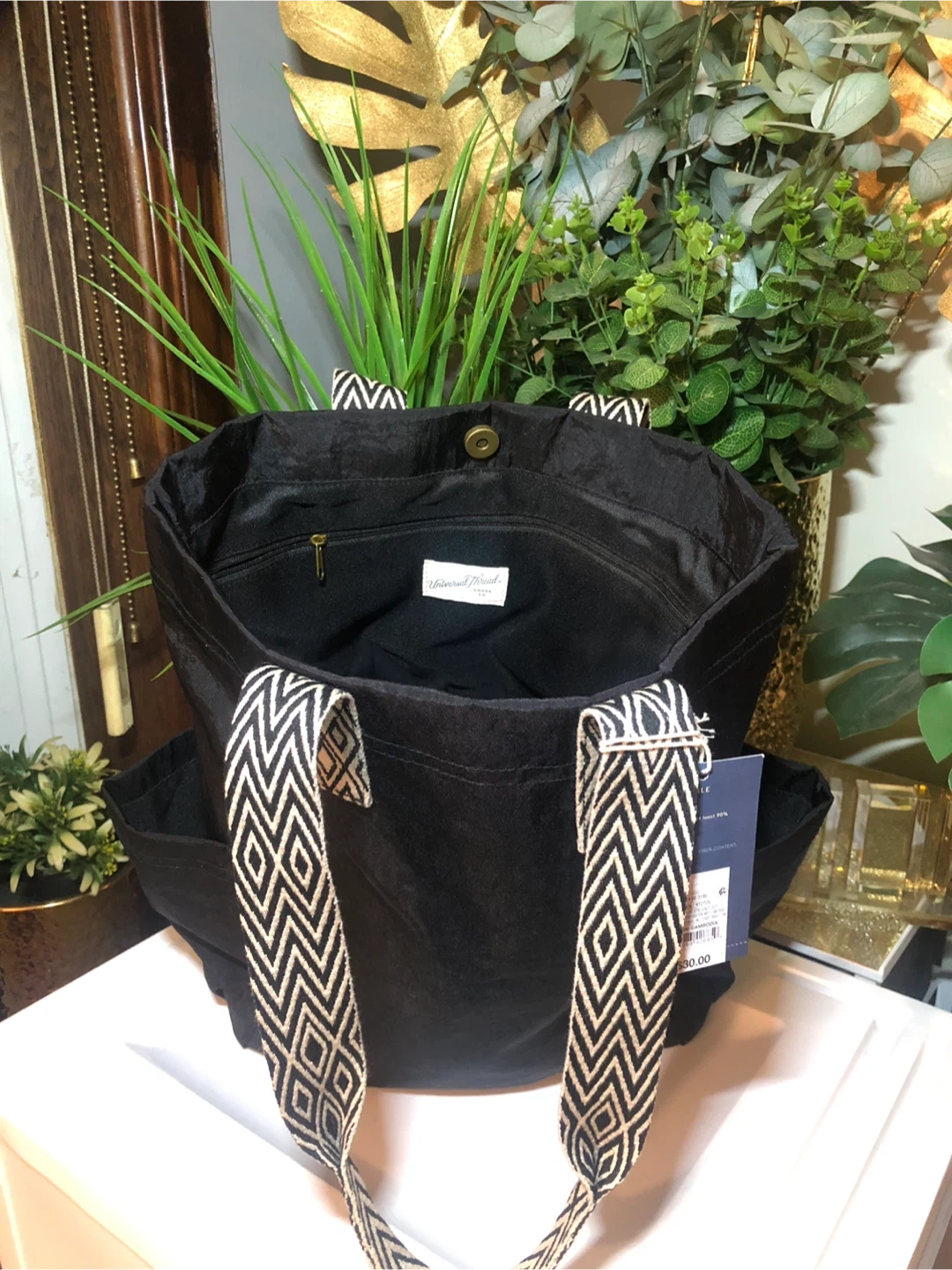 37This Universal Thread tote bag is in new condition with tags! It's a stylish black color with unique patterned straps. Originally bought for $30