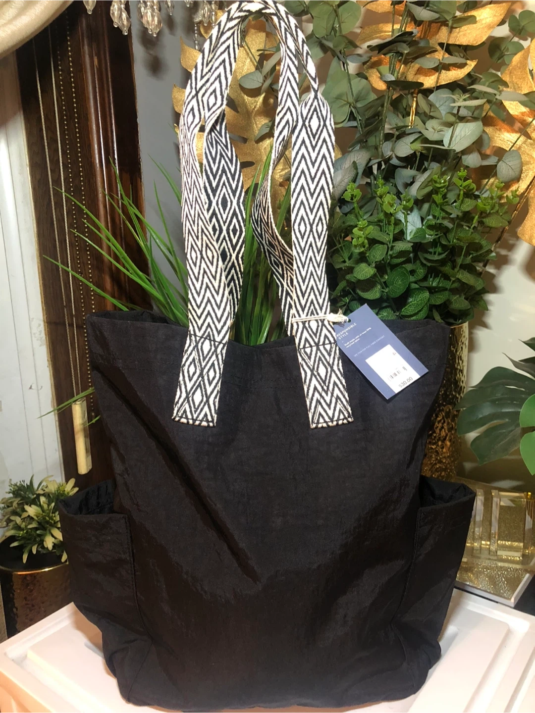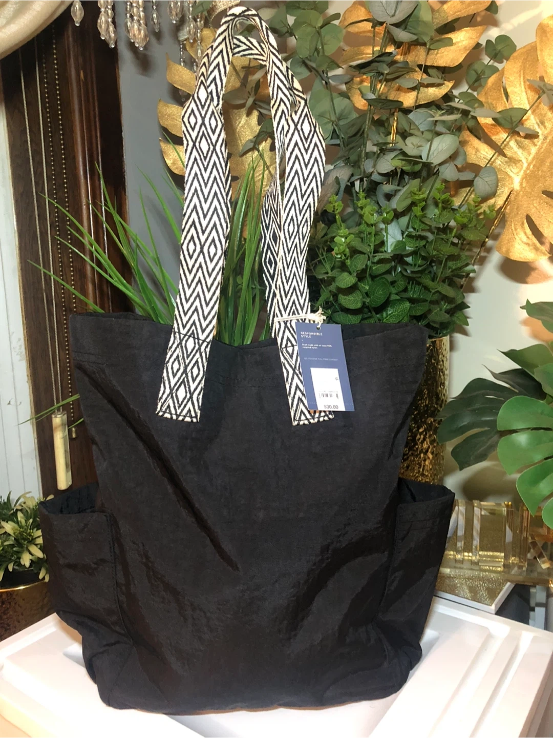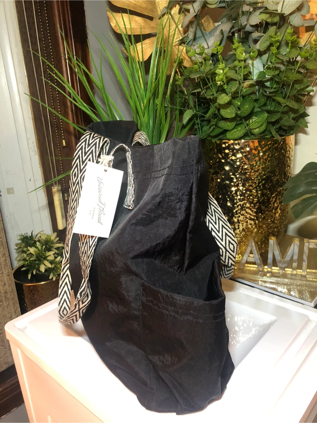 37This Universal Thread tote bag is in new condition with tags! It's a stylish black color with unique patterned straps. Originally bought for $30
