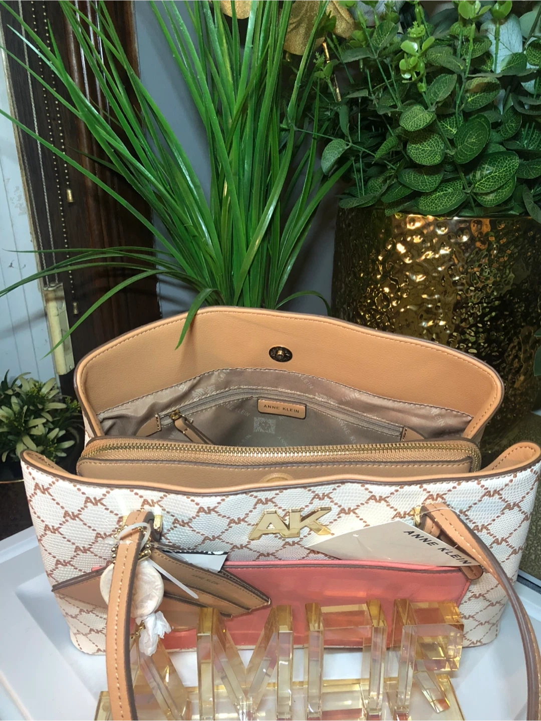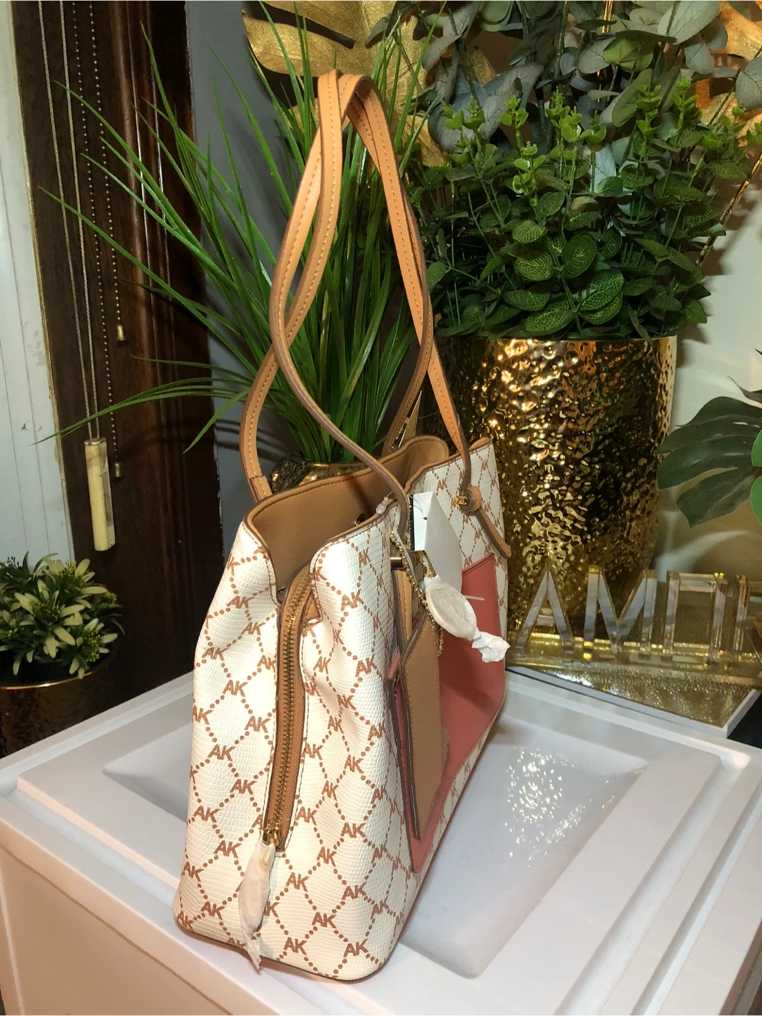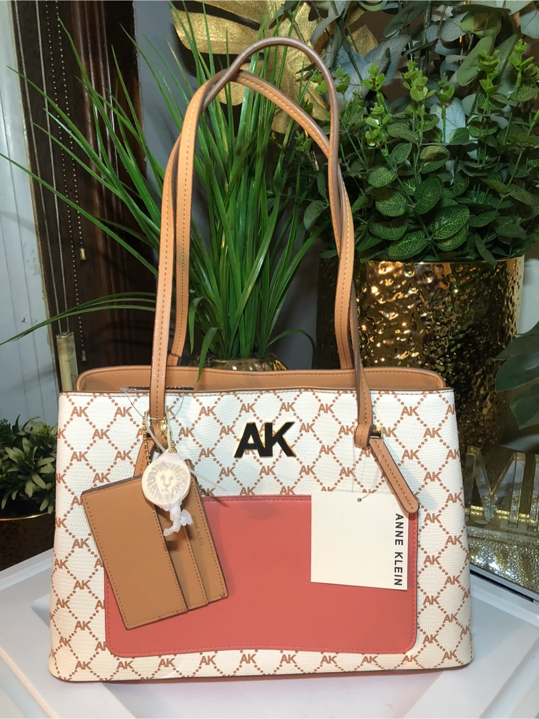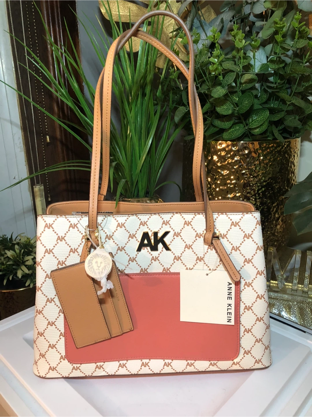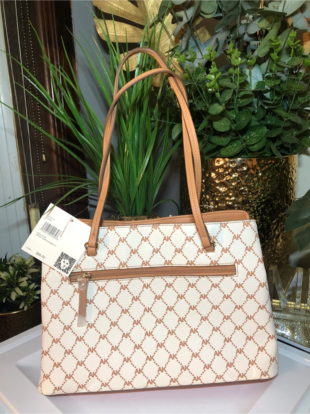 15Stylish Anne Klein tote bag with a unique pattern. It features a front pocket and comfortable straps. Perfect for everyday use!