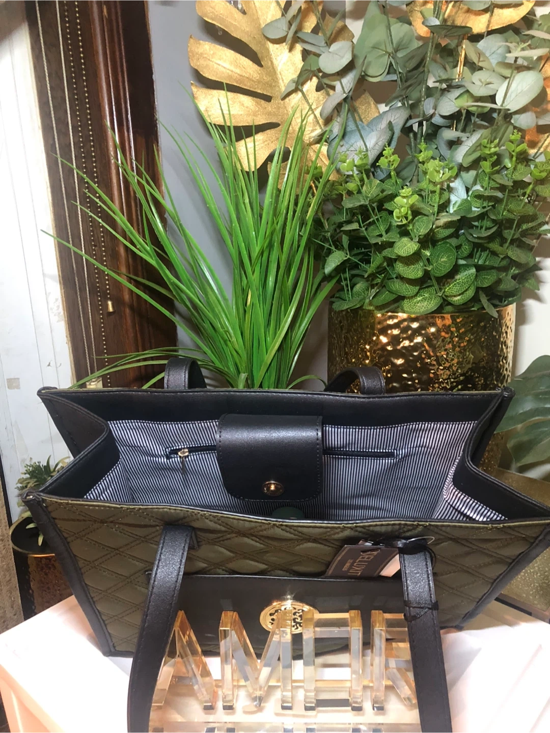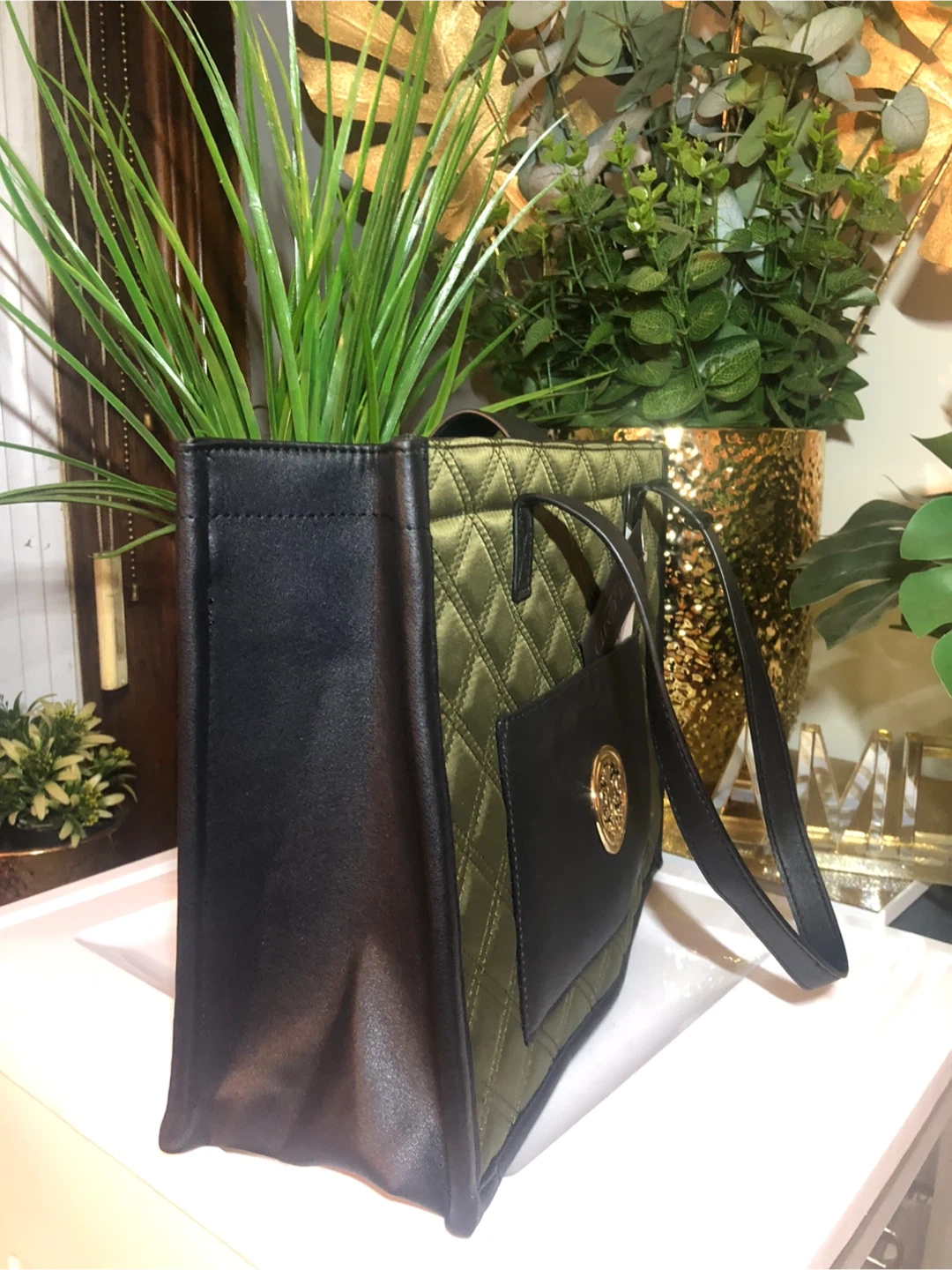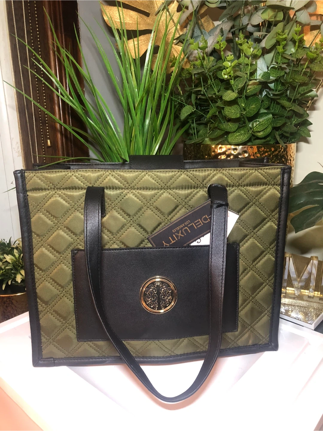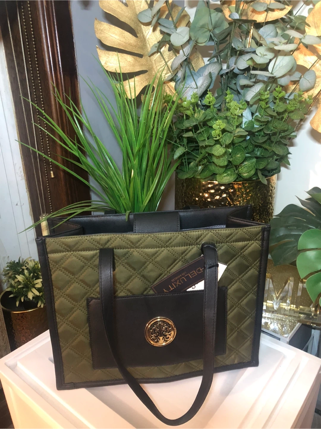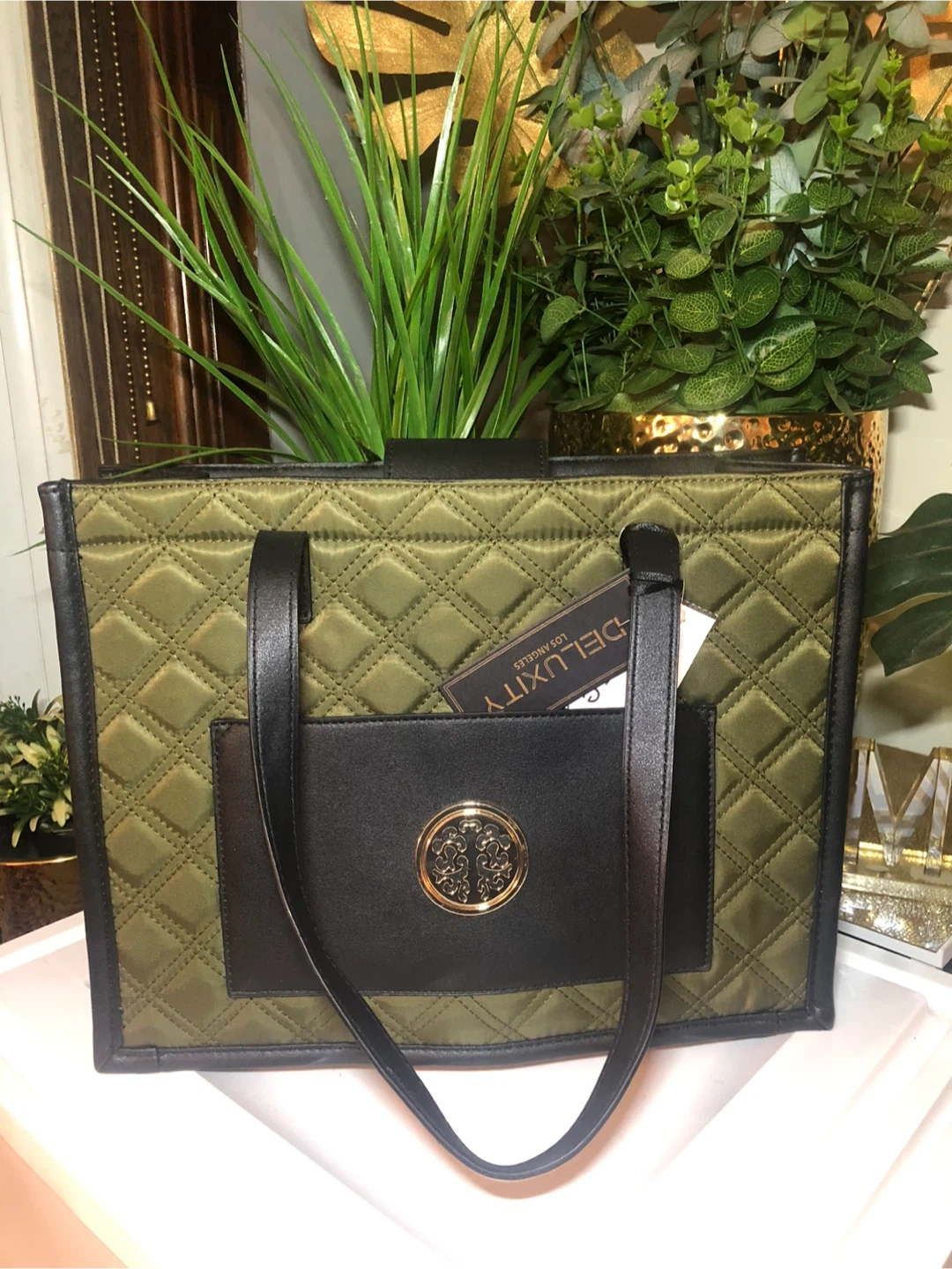 37I'm selling a DELUXITY Los Angeles tote bag. It's an olive green color with black accents. Perfect for everyday use!