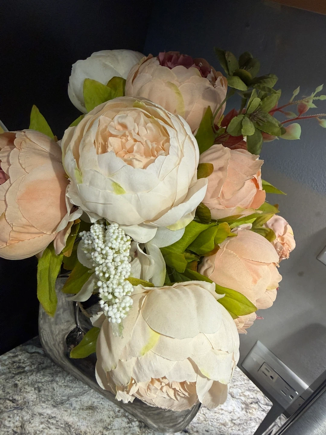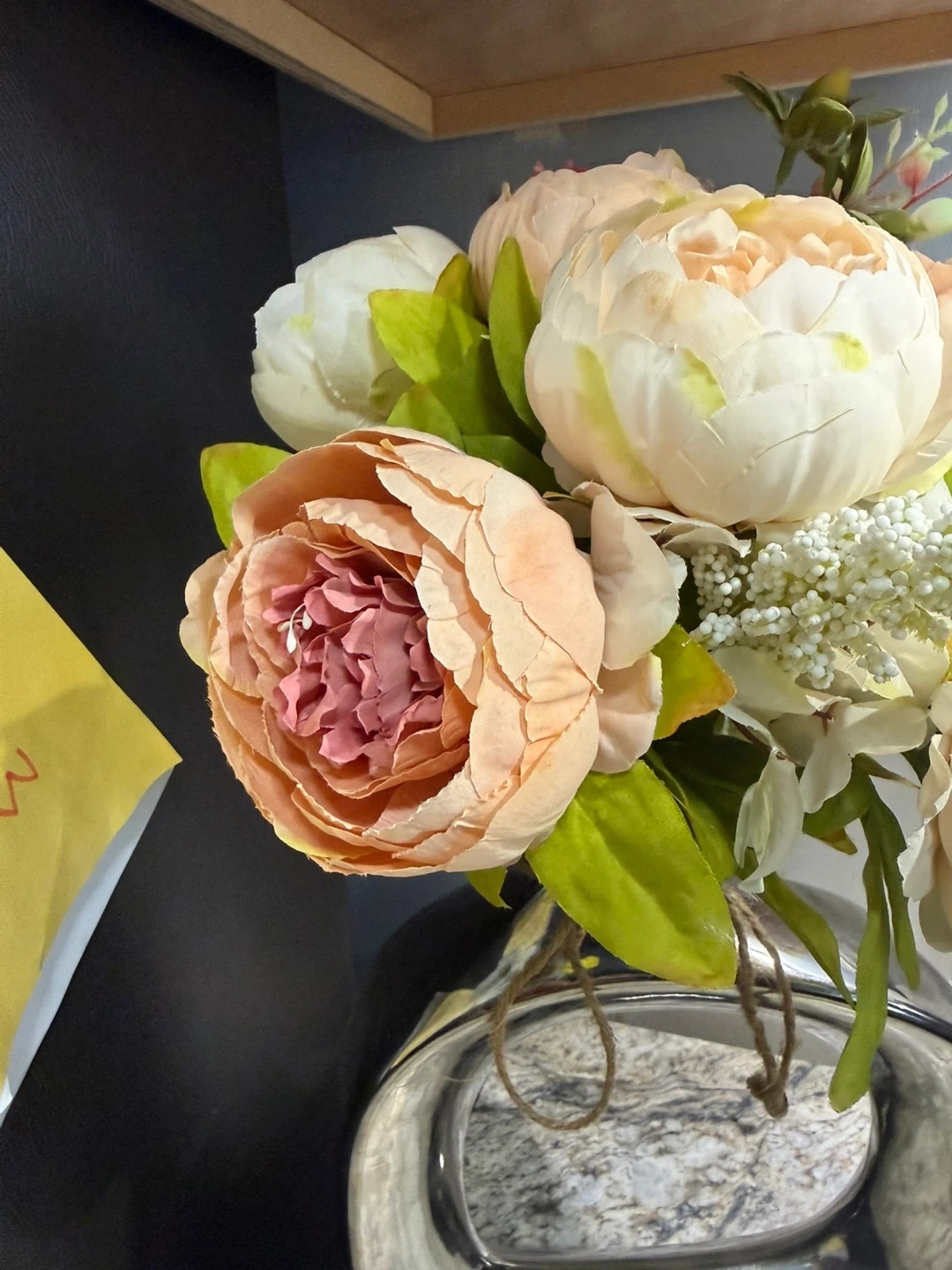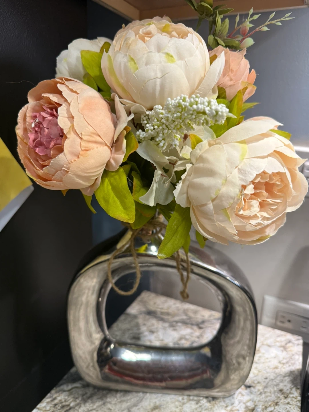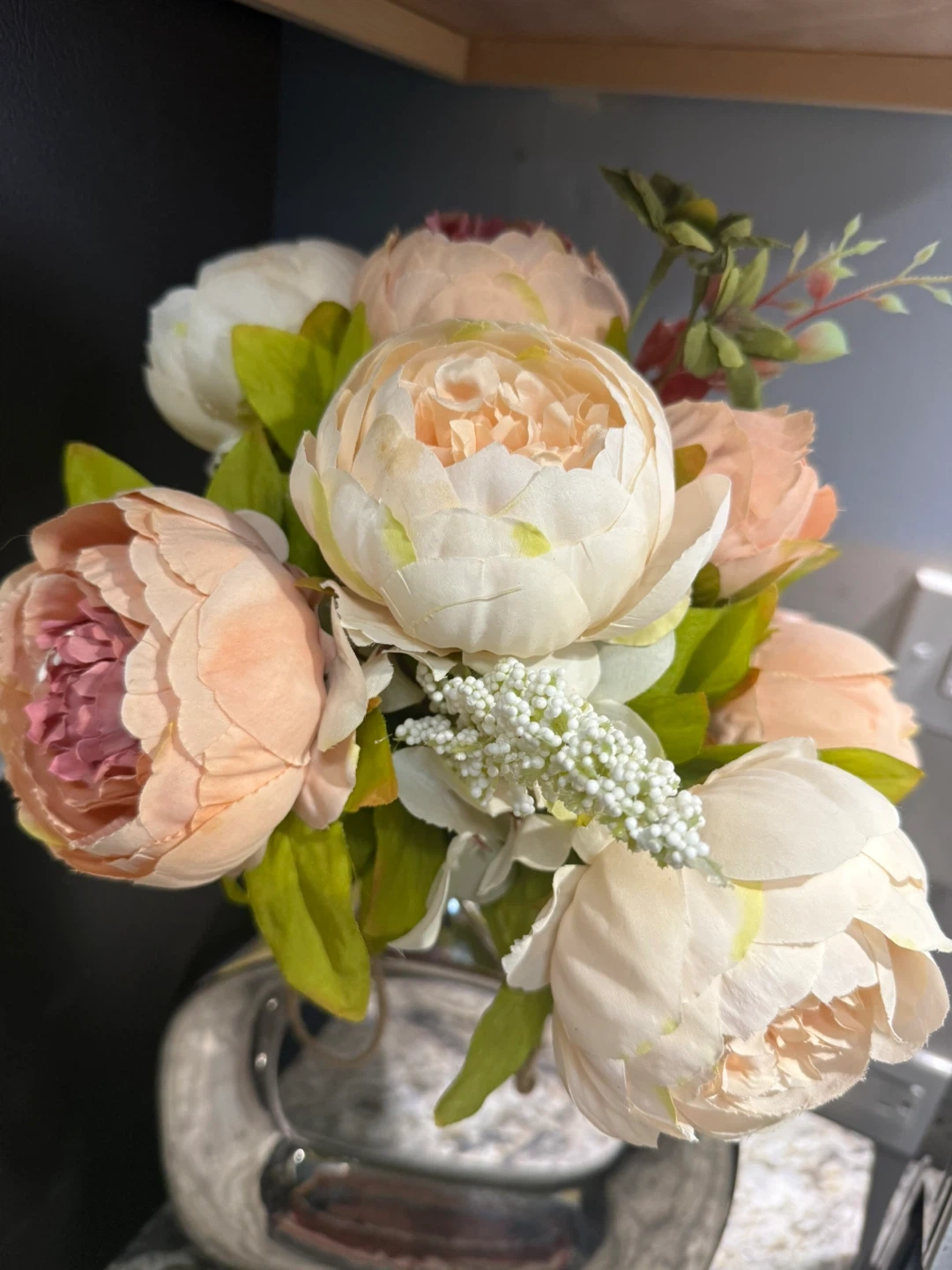 Selling a beautiful artificial flower arrangement. It features a mix of peach, pink, and white flowers with green leaves in a silver vase. Perfect for adding a touch of elegance to any room