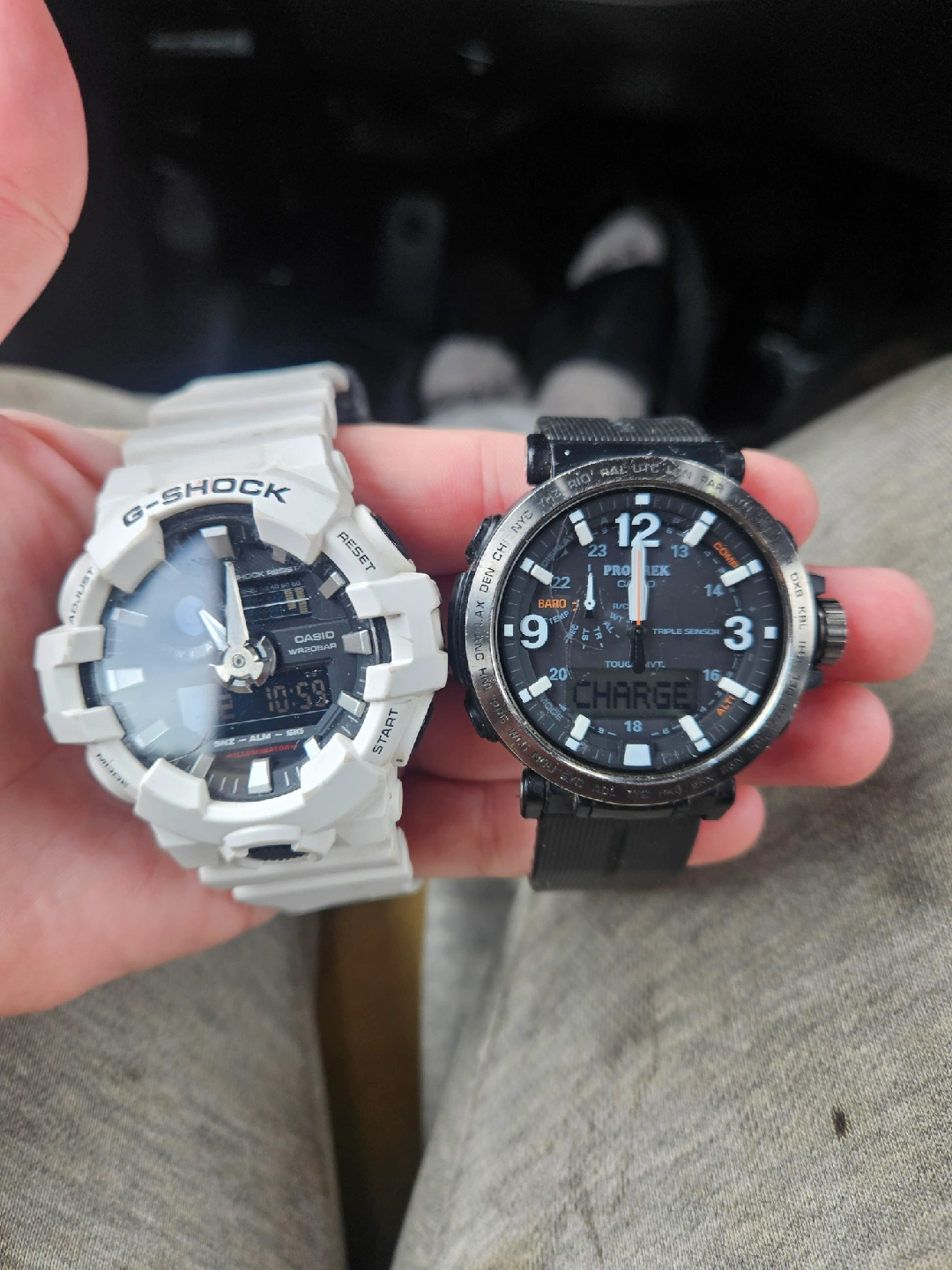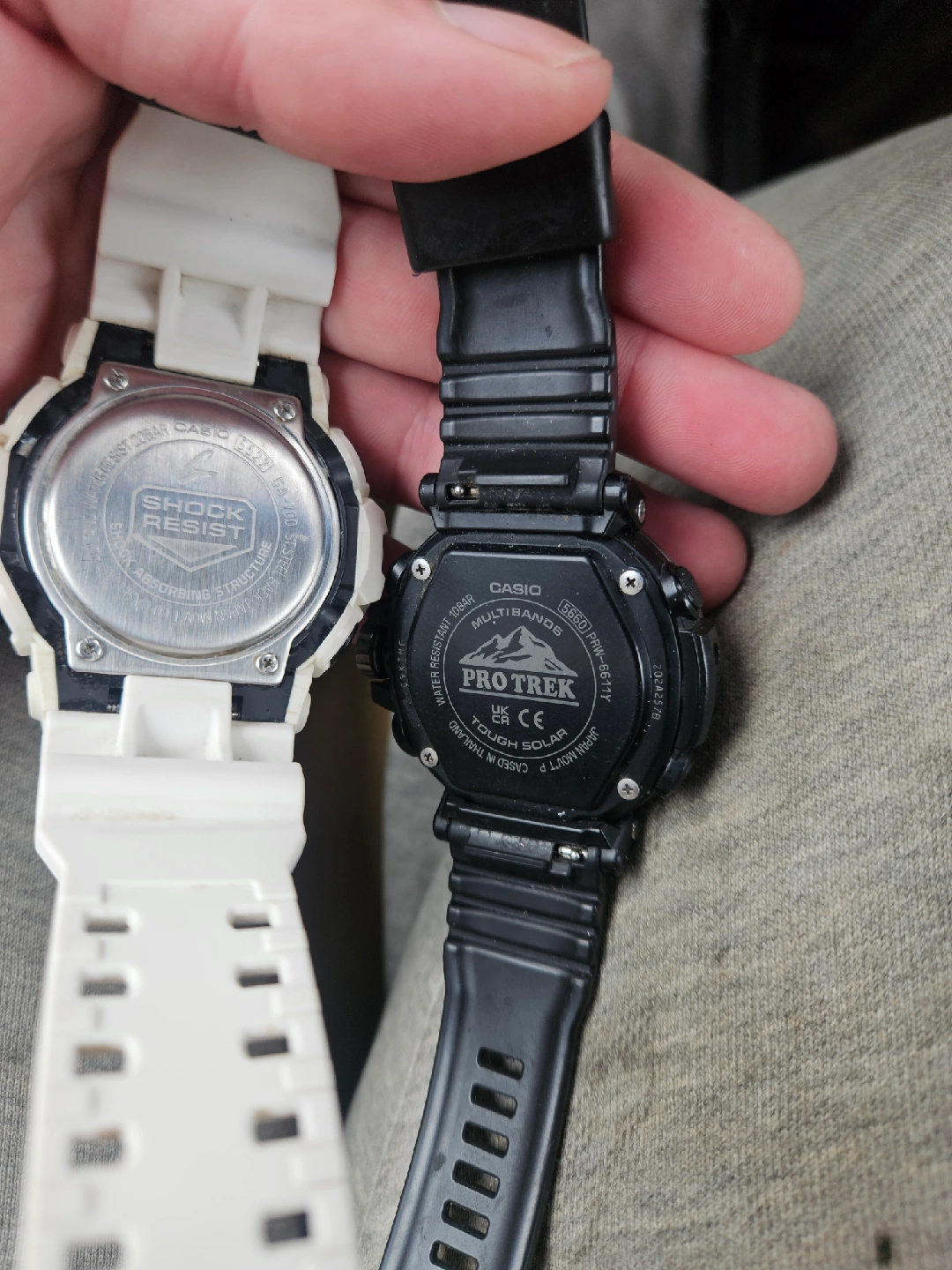 Selling a Casio G-Shock and a Casio Pro Trek watch together. The G-Shock is white($50), and the Pro Trek is black ($50). The watch face of the Pro Trek has a scratch. Both are in good condition and ready for a new owner! If you play nice I'll throw in a 3rd casio for free.
