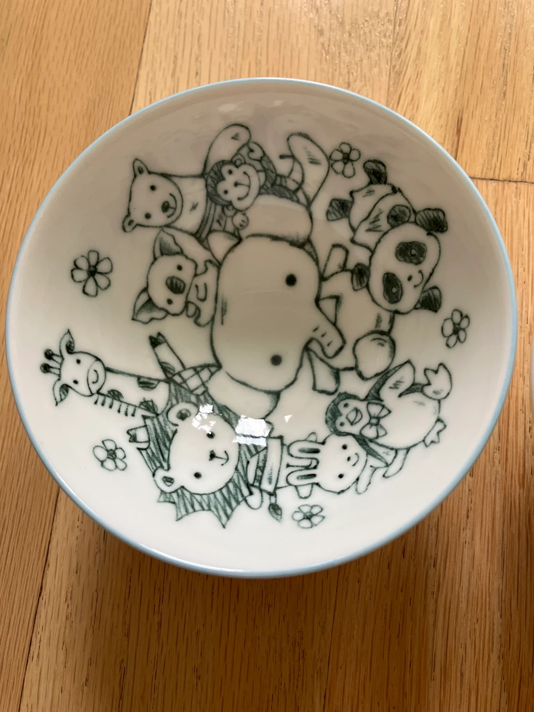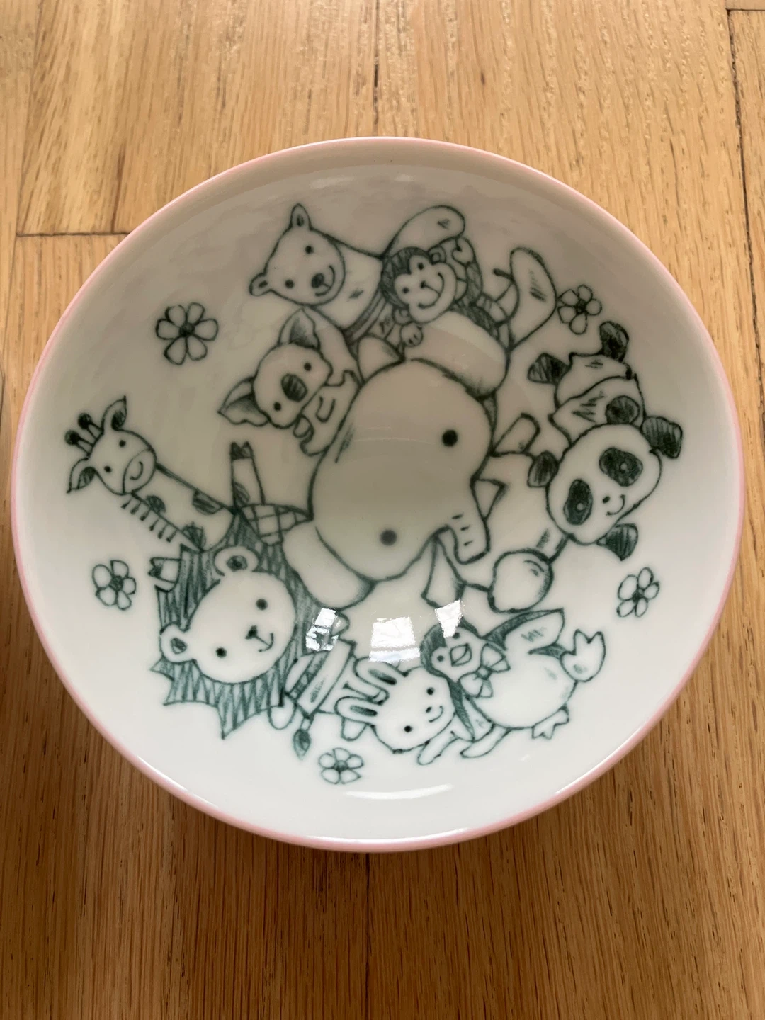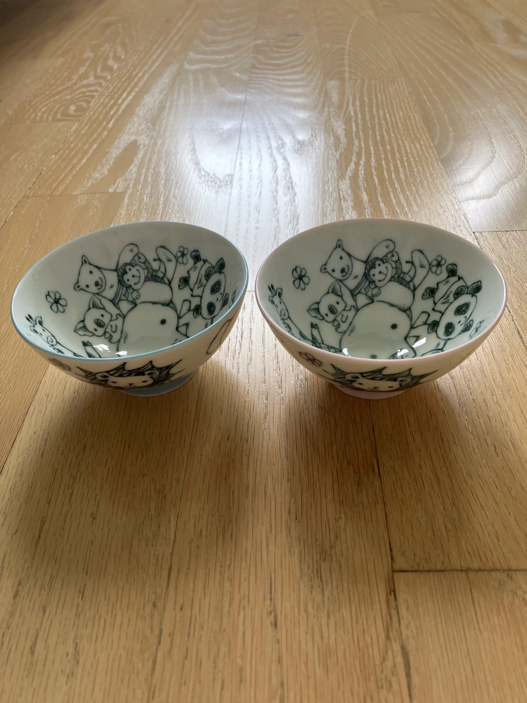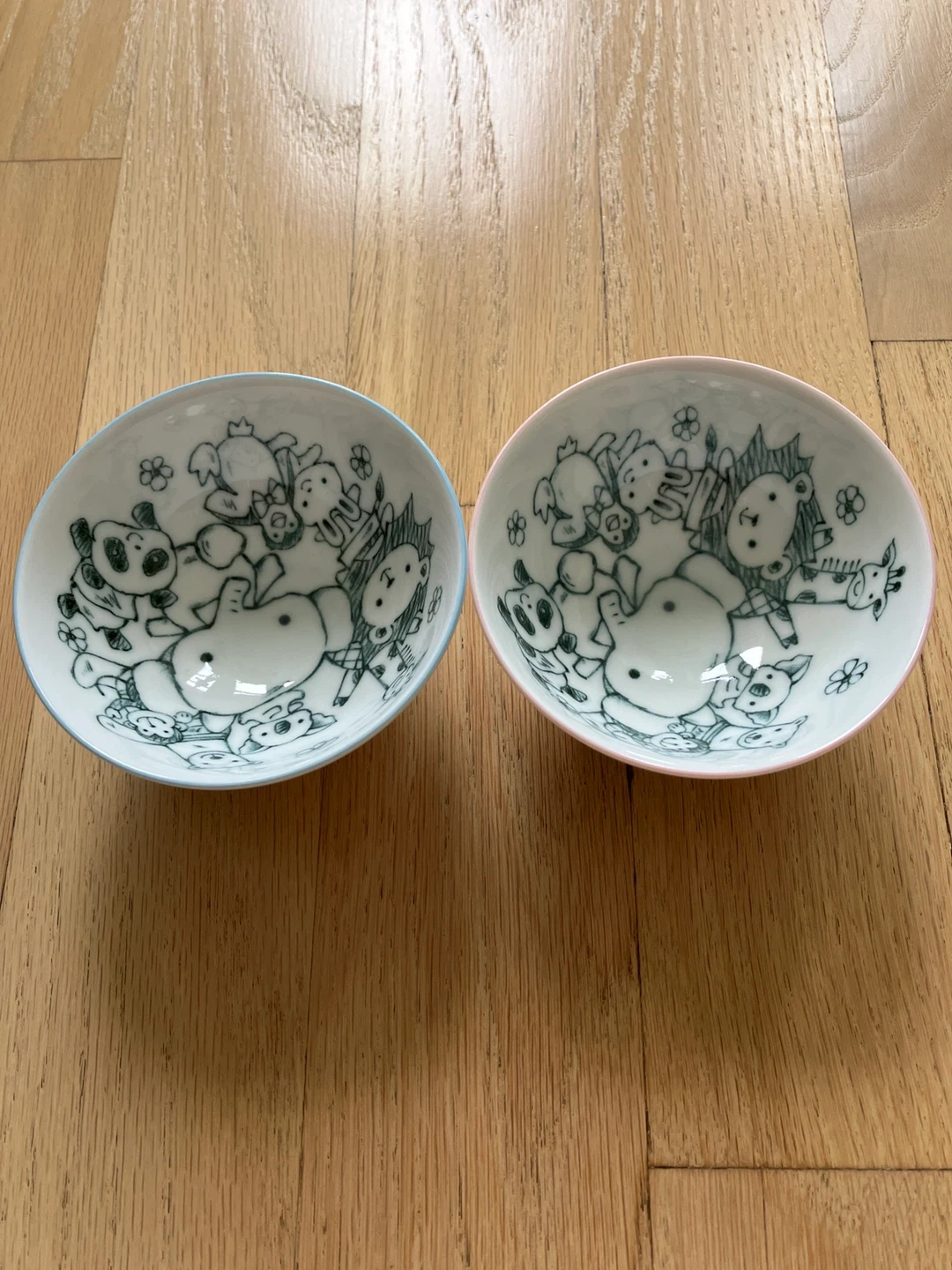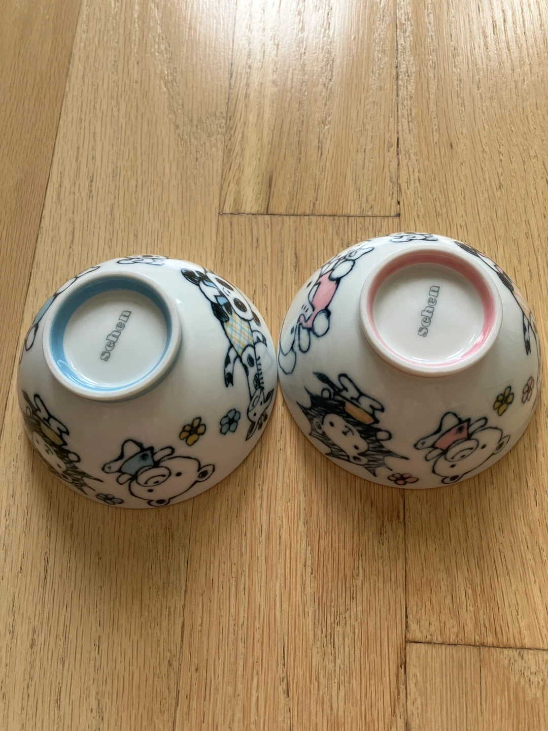 430Here's a set of two adorable Schen bowls! One has a blue rim and the other has a pink rim. Both feature a cute animal design, perfect for kids or anyone who loves whimsical dishware
