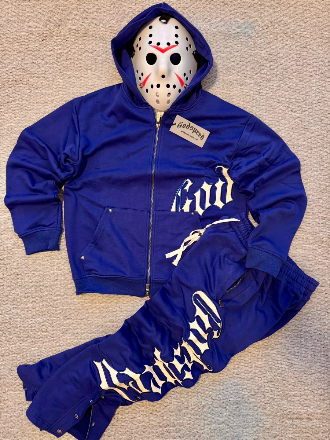 Selling a Godspeed tracksuit in blue! The set includes a zip-up hoodie and matching pants. Great for casual wear or workouts