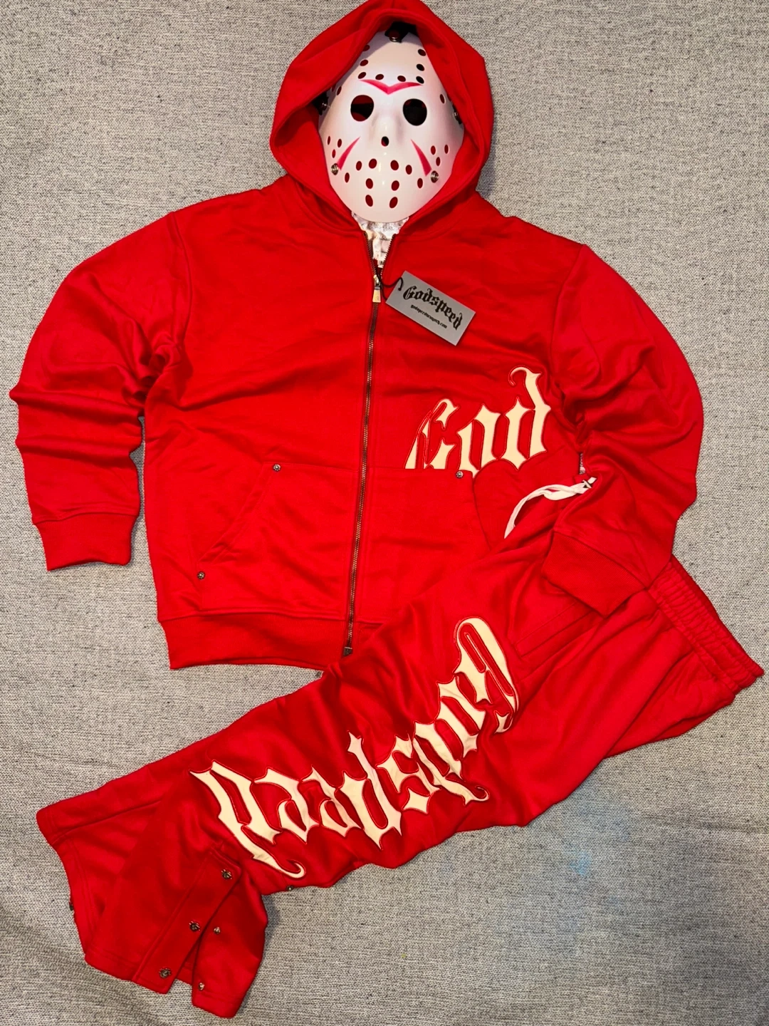 Selling a red Godspeed tracksuit. The set includes a zip-up hoodie and matching pants. The brand logo is prominently displayed on both pieces. Great for casual wear or workouts!