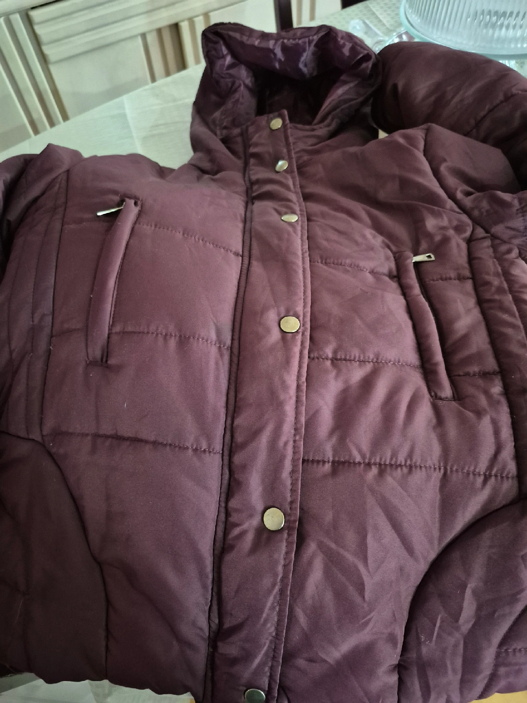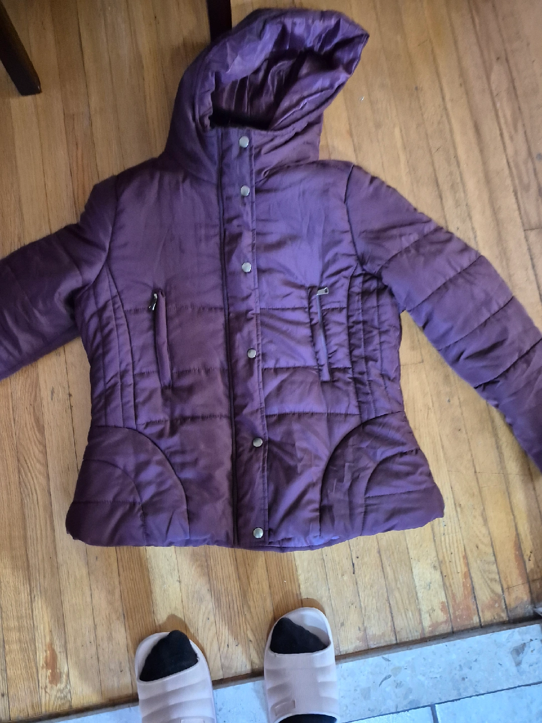 Selling a burgundy puffer jacket, perfect for staying warm during the colder months! It features a hood and a button-up front with pockets