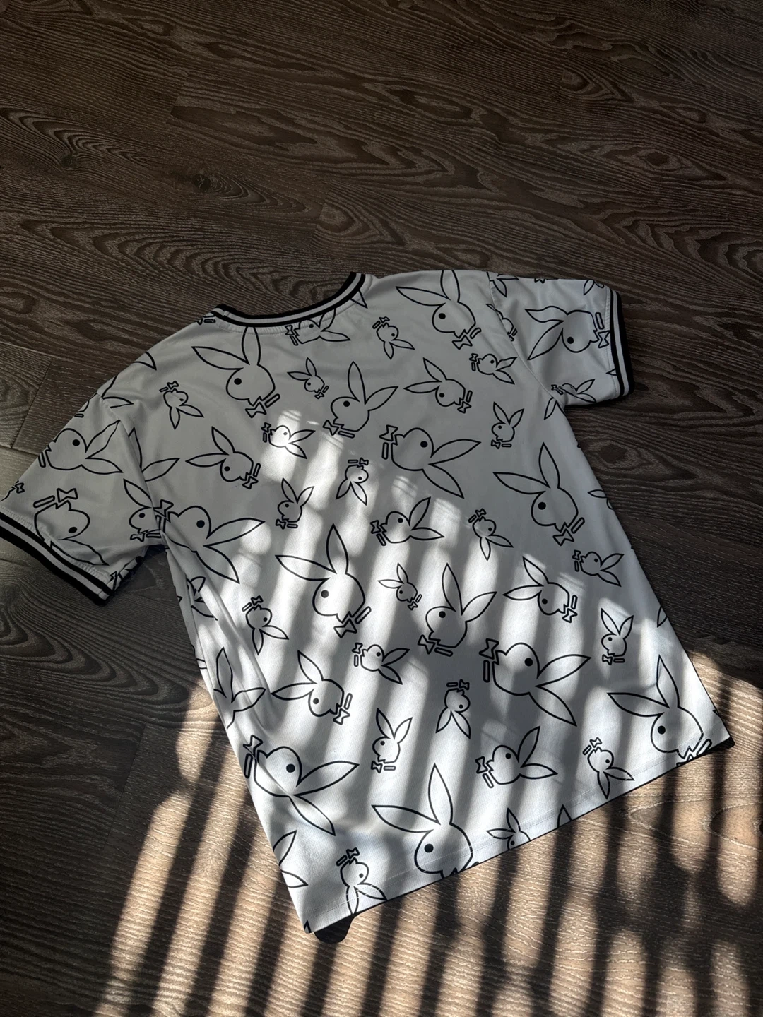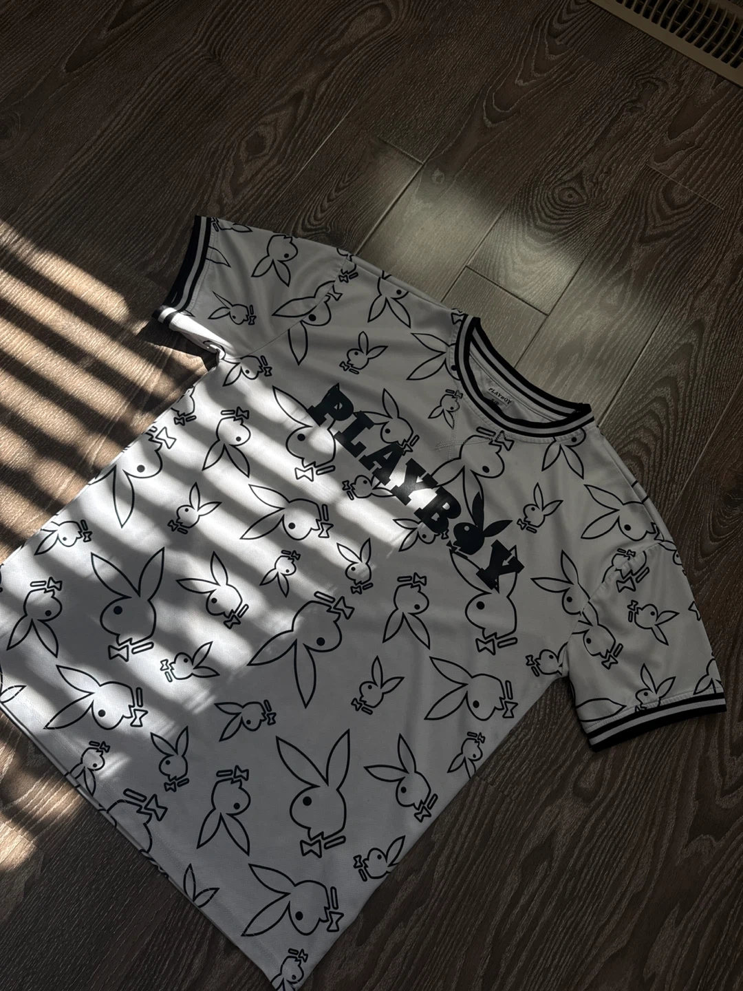 25Selling a fun Playboy t-shirt! It's white with a black bunny print all over. The collar and sleeves have a black and white striped trim. It's in great condition and ready for a new home! size small