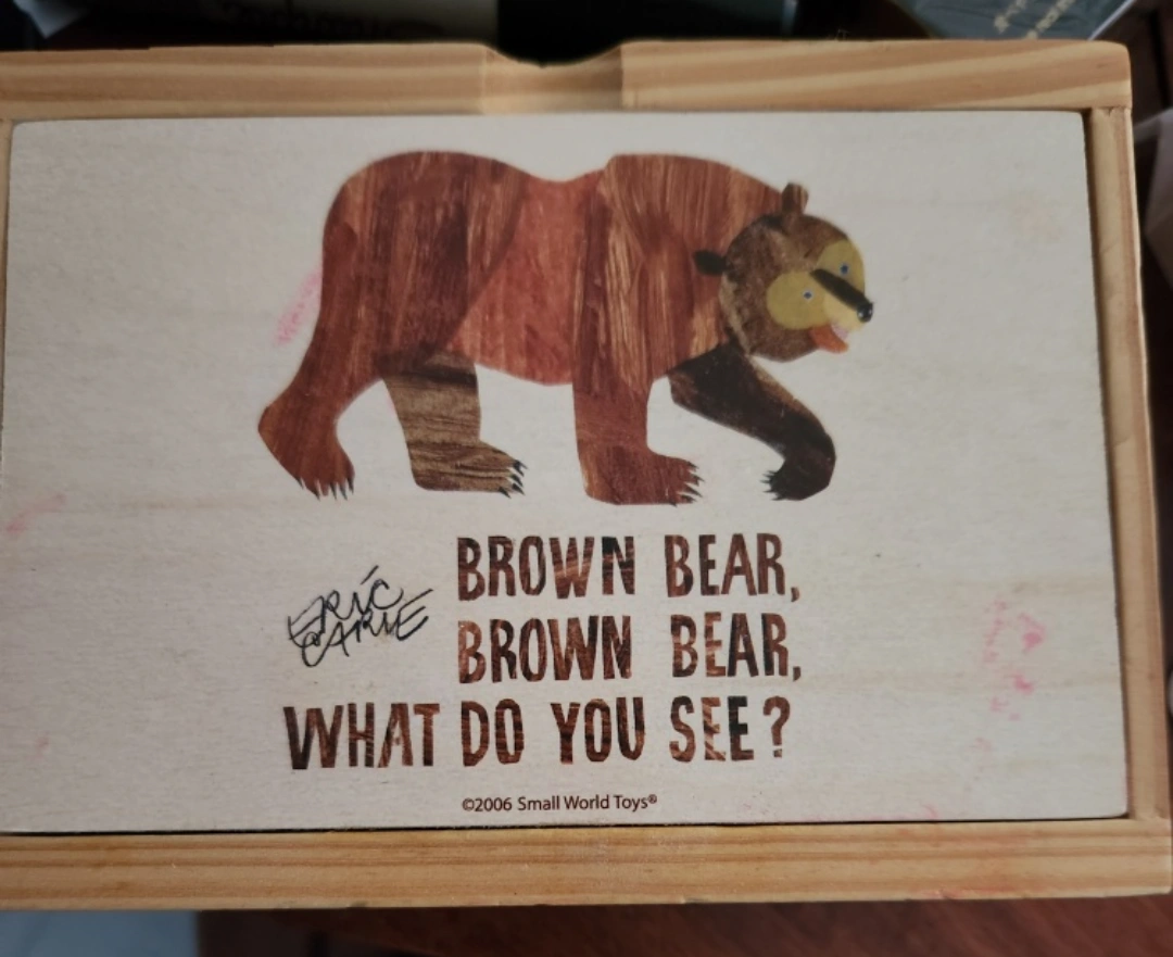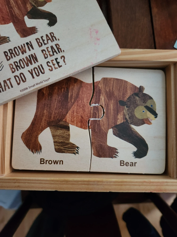 I have a gently used wooden puzzle based on the popular children's book, 'Brown Bear, Brown Bear, What Do You See?' by Eric Carle. It's in great shape and comes in its original wooden box. Perfect for toddlers learning colors and animals!